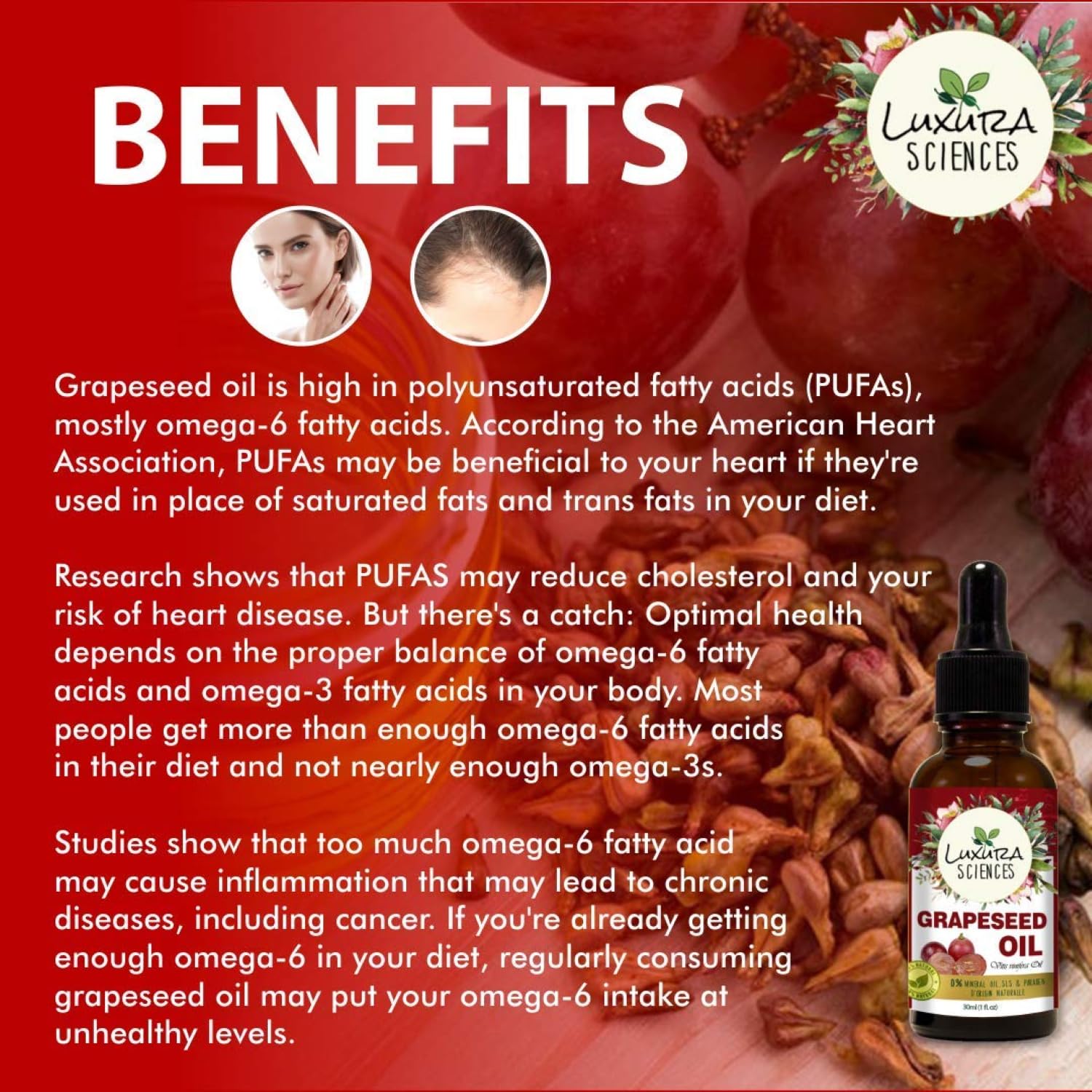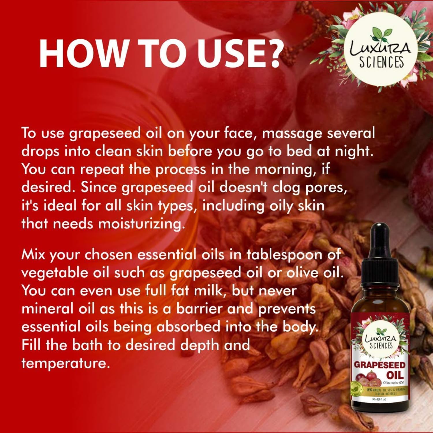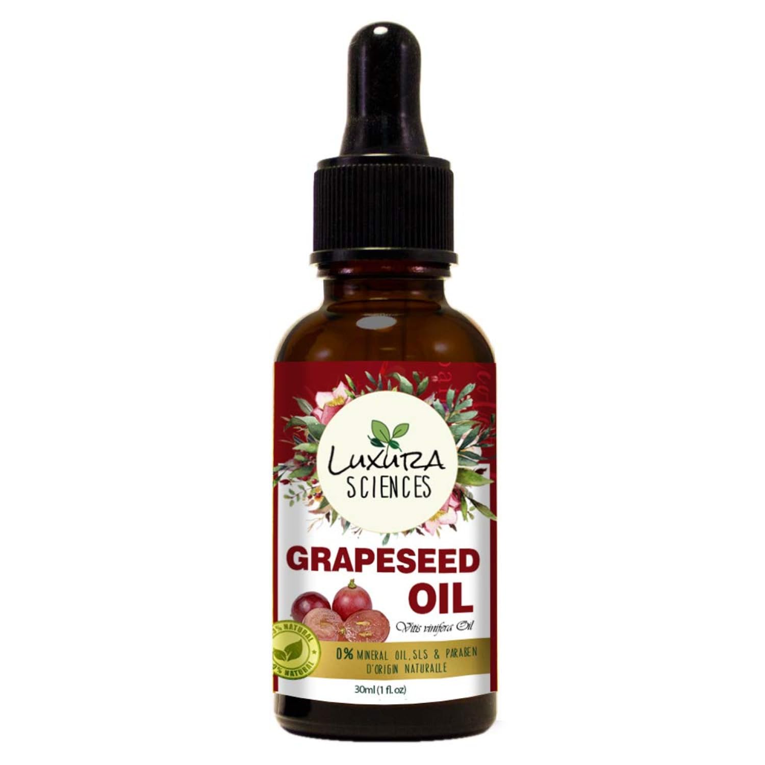 Luxura Sciences organic grape seed oil natural cold pressed rich in vitamin A E K lightweight non greasy moisturizer for skin hair body nourishing massage oil promotes healthy scalp youthful glow