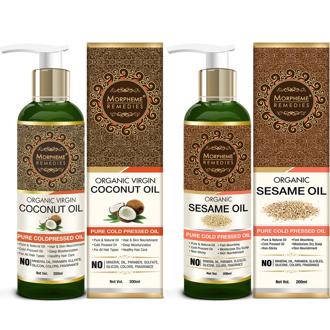 Virgin Coconut oil is pure unrefined cold pressed oil extracted from fresh coconut milk. The cold process method ensures that all the vital nutrients & the natural goodness of fresh coconuts are retained. This is considered the highest quality and healthiest form of coconut oil.Coconut oil can help improve the texture evenness of tone pore size and luminosity of your skin. Coconut oil helps keep your hair fully moisturized it promotes full growth and creates strong hair whilst keeping the scalp free from flakes.Sesame oil called til oil in Sanskrit has reportedly been known since Vedic times. The ancient ayurvedic scholar Charaka calls it is the best of all oils. It is rich in linoleic acid vitamin A B E abundance of minerals and has anti-bacterial and antioxidant properties. Sesame oil is very nourishing and prevents the skin from getting excessively dry. Sesame oil massaged into the scalp once a week is an excellent way to nourish the scalp and restore the natural balance and luster of hair. Sesame oil can be a very versatile ally in your efforts toward better health.