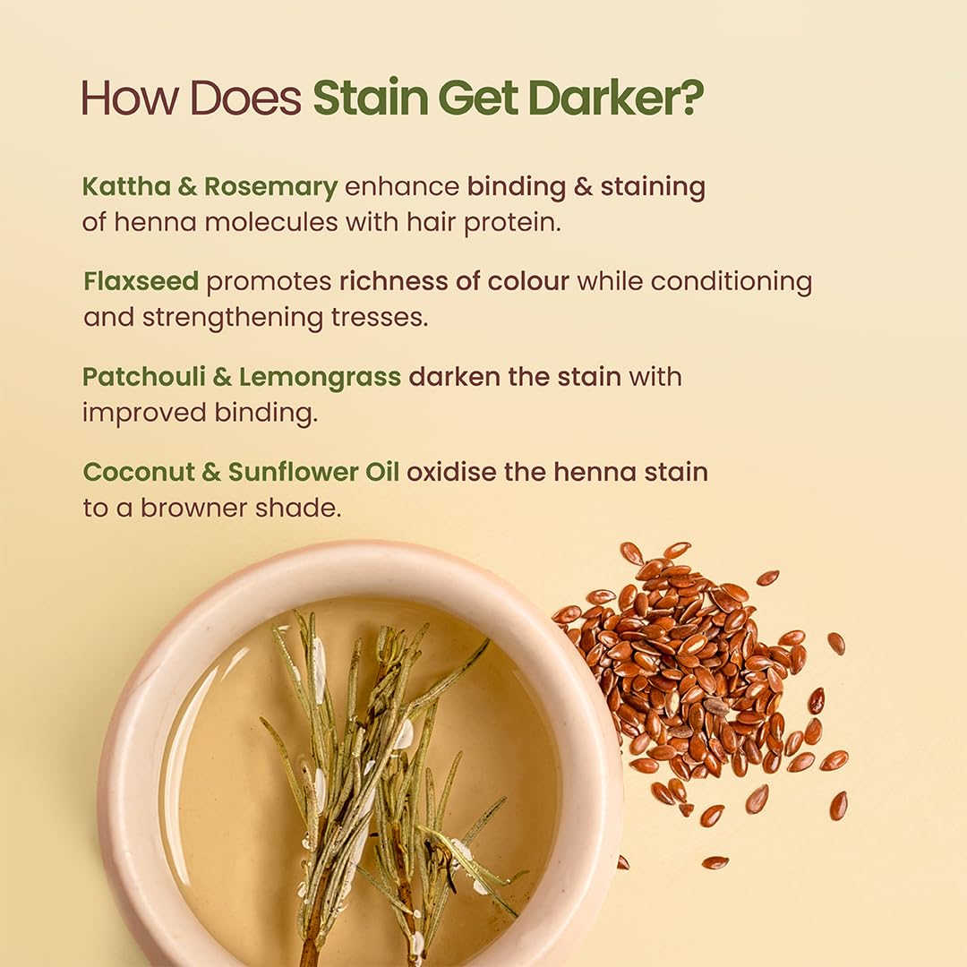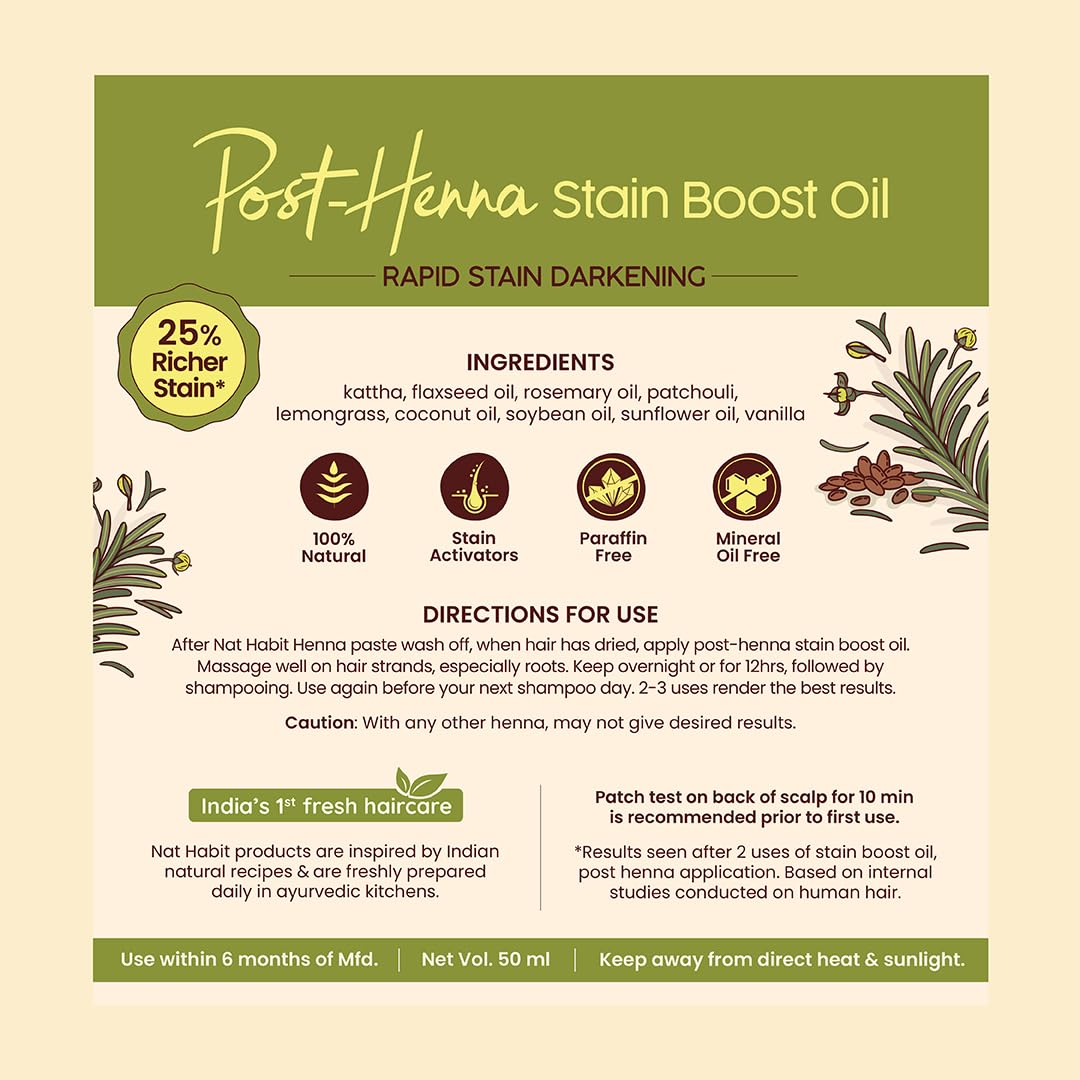PostHenna Stain Boost Oil is a unique blend of stainactivating natural herbs and oils that rapidly intensifies the color of hennatreated hair. The oil also help in deep nourishment post henna relieving dryness eczema & leaving hair shiny & lustrous. It contains: Kattha & Rosemary: Enhance binding & staining of henna molecules with hair protein. Flaxseed: Promotes richness of colour while conditioning and strengthening tresses. Patchouli & Lemongrass: Darken the stain with improved binding. Coconut & Sunflower Oil: Oxidise the henna stain to a browner shade.