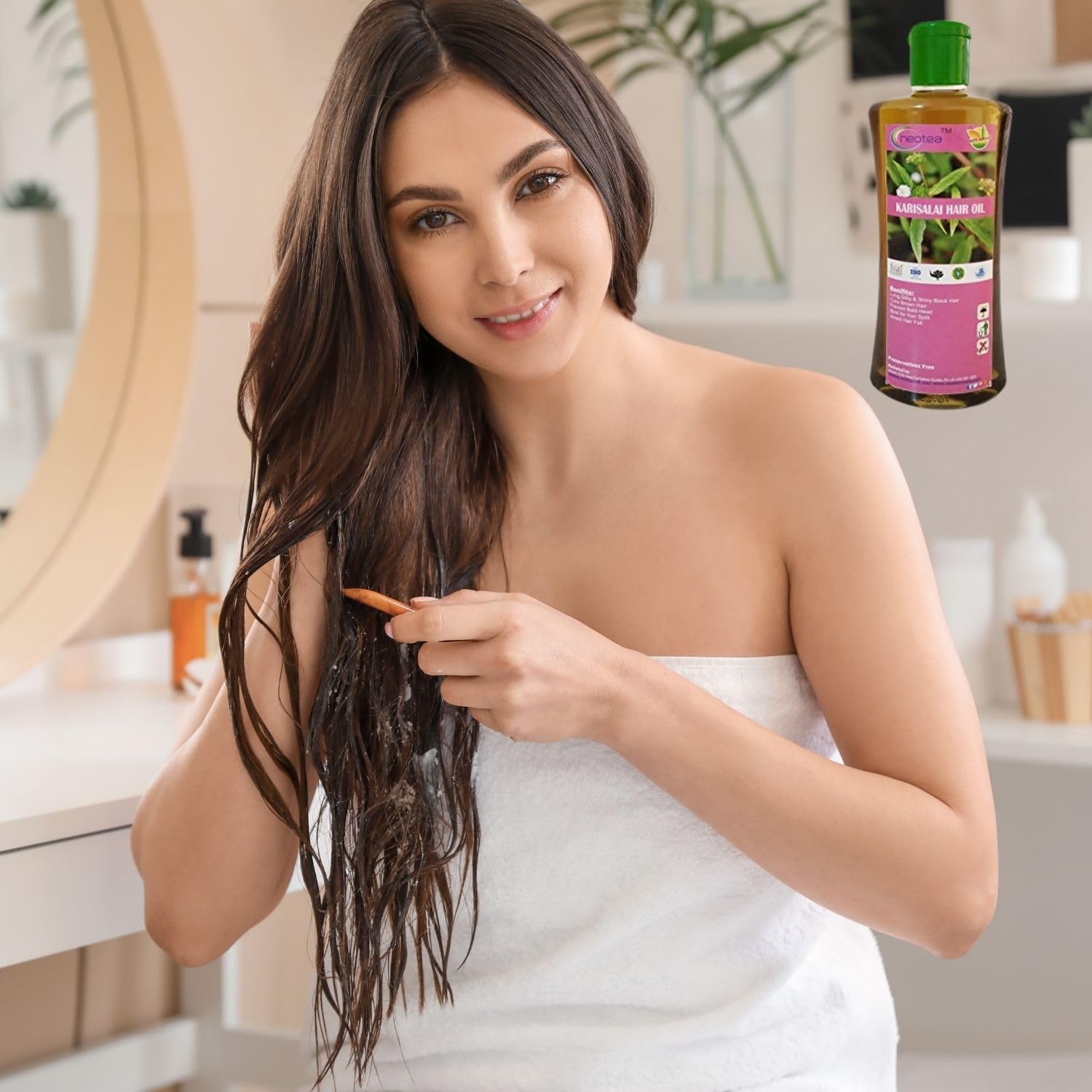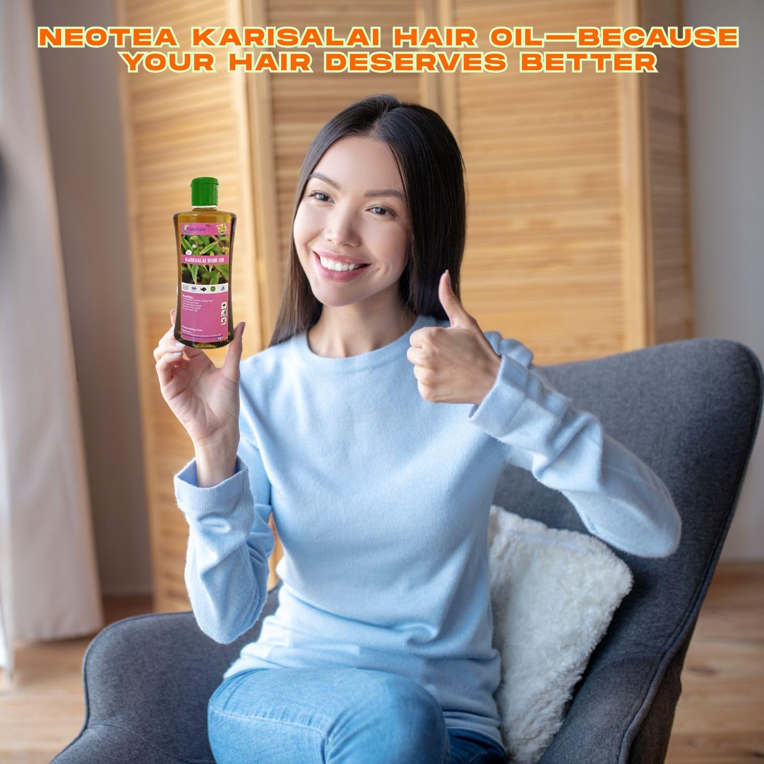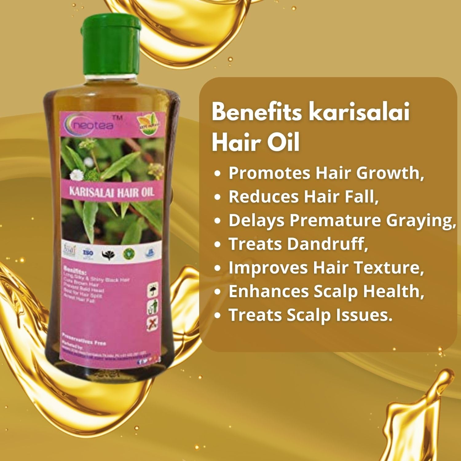 Neotea Karisalankanni Hair Oil is an Ayurvedic blend designed to nourish and protect your hair. Derived from Eclipta prostrata (commonly known as Karisalankanni False Daisy or Bhringraj) this herbal oil is packed with natural properties that support hair health. Known for its anti-dandruff benefits it helps maintain a smooth thick and healthy scalp while preventing irritation and dryness. Key Features and Benefits: Anti-Dandruff Protection: Karisalankanni a traditional herb is well-known for its effectiveness in controlling dandruff keeping your scalp clean healthy and free from flakes. Promotes Smooth & Thick Hair: Regular use of this oil helps nourish and strengthen hair follicles resulting in smoother thicker and more manageable hair. Herbal and Chemical-Free: Neotea Karisalankanni Hair Oil is made from 100% natural herbal ingredients ensuring a chemical-free and gentle solution for your hair and scalp. Rich in Ayurvedic Herbs: This oil is infused with Eclipta prostrata a plant that is commonly found in warm tropical areas and has long been used in Ayurvedic medicine for promoting hair growth improving hair texture and enhancing overall scalp health. Multi-Cultural Herbal Benefits: Known by various names in different languages such as Bhringraj in Hindi Kaikeshi in Malayalam and Galagara in Telugu Karisalankanni has been cherished for centuries for its ability to treat hair and scalp issues naturally. Moisturizes and Nourishes: This oil deeply nourishes the scalp and hair preventing dryness and promoting hydration. It also helps in maintaining the natural shine and health of your hair. Trusted Brand â Neotea: Neotea offers a wide range of health and wellness products including dry fruits herbal powders organic cocoa powder and more all aimed at supporting your health and beauty routine. Add Neotea Karisalankanni Hair Oil to your daily hair care regimen for smoother thicker and dandruff-free hair. Trust the power of natural herbs for healthy beautiful hair!