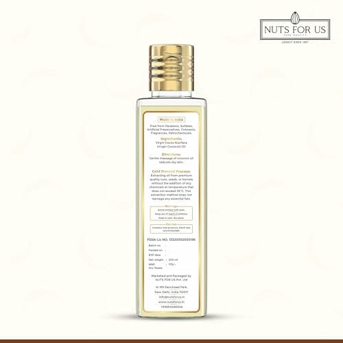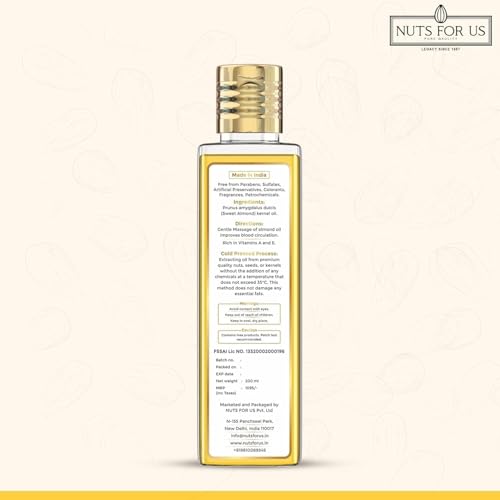 Nuts For Us Coconut Oil Pack of 1 is a natural cold-pressed oil derived from handpicked and hand sorted coconuts. Our philosophy of source to skin at Nuts For Us is embodied in our range of cold-pressed oils. Our cold-pressed Coconut Oil is derived with a method to retain to all natural and nourishing properties of the coconuts. Our oil is undiluted preservative free chemical free with no additives and no fragrance added. Our oil is certified and edible. Quantity is 100ml Form Sold is Liquid Made in India Cold Pressed Edible Coconut Oil. Vegetarian It is a natural cold-pressed oil derived from handpicked and hand sorted dried coconuts. Our oil is undiluted preservative free chemical free with no additives and no fragrance added. Consumption of one teaspoon of coconut oil every morning to improve digestion and boost energy levels for throughout the day. This oil improves skin complexion and tone while reduces signs of aging. It can be used to prevent stretch marks during pregnancy and for others with dry skin syndrome. It can be used as a natural makeup remover and a night cream for medium to dry skin. It can be used as deep conditioner for hair. It enhances hair quality and boosts hair growth.oil is undiluted preservative free chemical free; It has no additives and fragrance. Nuts For Us Cold Pressed Sweet Almond Oil sourced from the finest almonds this pure natural badam tel is rich in vitamins antioxidants and essentil fatty acids that provide a multitude of benefits. Perfect for hair growth radiant skin and therapeutic massage this almond oil is a must-have in your self-care routine. Nuts For Us Cold Pressed Sweet Almond Oil (200ml) comes in a pack of 2 ensuring you have enough to enjoy long-lasting benefits. Use it for daily hair care massage therapy or as a natural face and body moisturizer for healthier glowing skin.