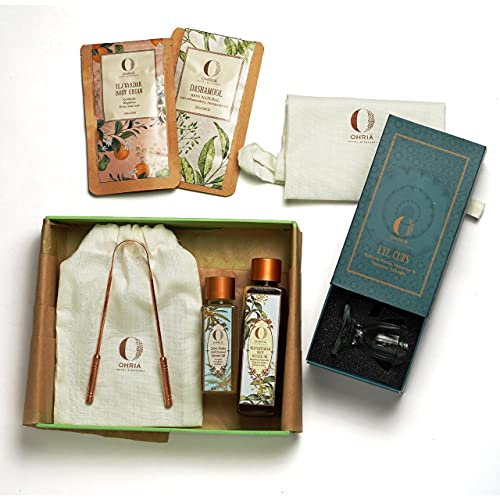 A holistic Ayurvedic detox box consisting of tools and products to empower your health by removing toxins on a daily basis. Incorporating these products and practices into your everyday regime will help your body be in rhythm & balance and will also remove toxins on a daily basis thus refraining from toxin accumulation. Also detoxification aids your body in seeking the optimum nutrition from food thus keeping you healthy. Detoxification additionally supports & promotes healthy skin and hair. The box is curated with the aim to return the body to its original healthy state: true luminous beauty supported by inner health. Dincharya Ritual: Oil pulling- Coconut oil Tongue scraping- Pure copper tongue cleaner Eye wash- Glass eye cups with Triphala powder Body Massage- Dhanwantaram Body Massage oil Exfoliation- Tej Vardak Body Ubtan Detox Bath- Dashamoola Powder
