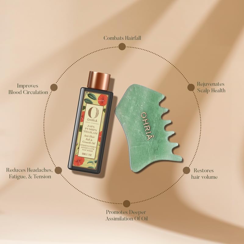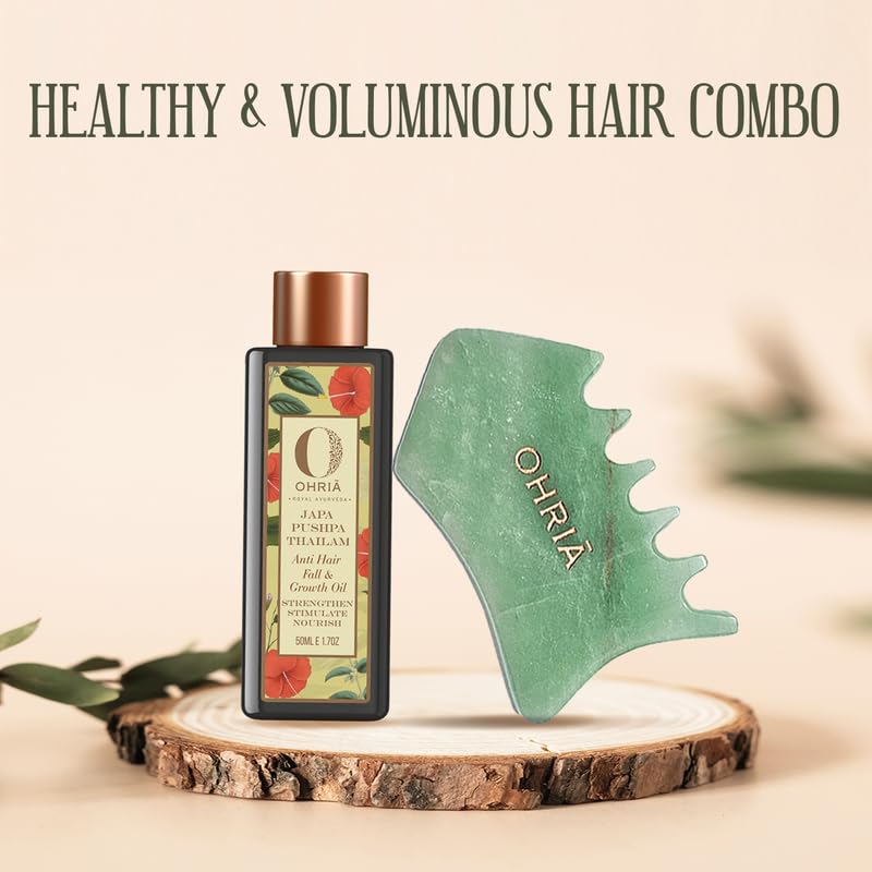 If volume is what your hair has been missing this Healthy & Voluminous Hair Combo is perfect for you. The combo is specially curated to revive your hairâs lost lustre and to deeply nourish. The tool helps rejuvenate the scalp promotes deeper assimilation of the product boosts blood circulation and provides relief from fatigue and stress. Japa Pushpa Thailam infused with Neeli Bhringadi Oil Hibiscus Flowers Indian Jujube Leaves and Kalonji effectively combats hair fall delays greying and rejuvenates overall hair health. Relax strengthen and revitalize your hair with each use! The Combo Contains: The Ultimate Skin & Hair Growth Tool Japa Pushpa Thailam 50 ml