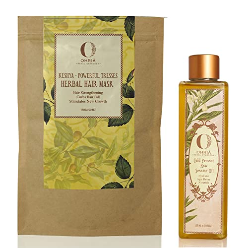 The Kit Contains: Keshya Powerful Tresses Herbal Hair Mask 150gm Cold Pressed Raw Sesame Oil 100ml