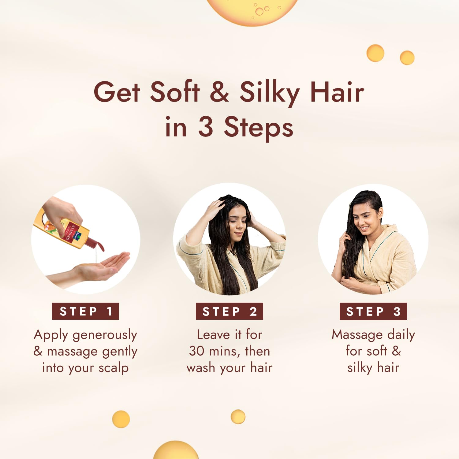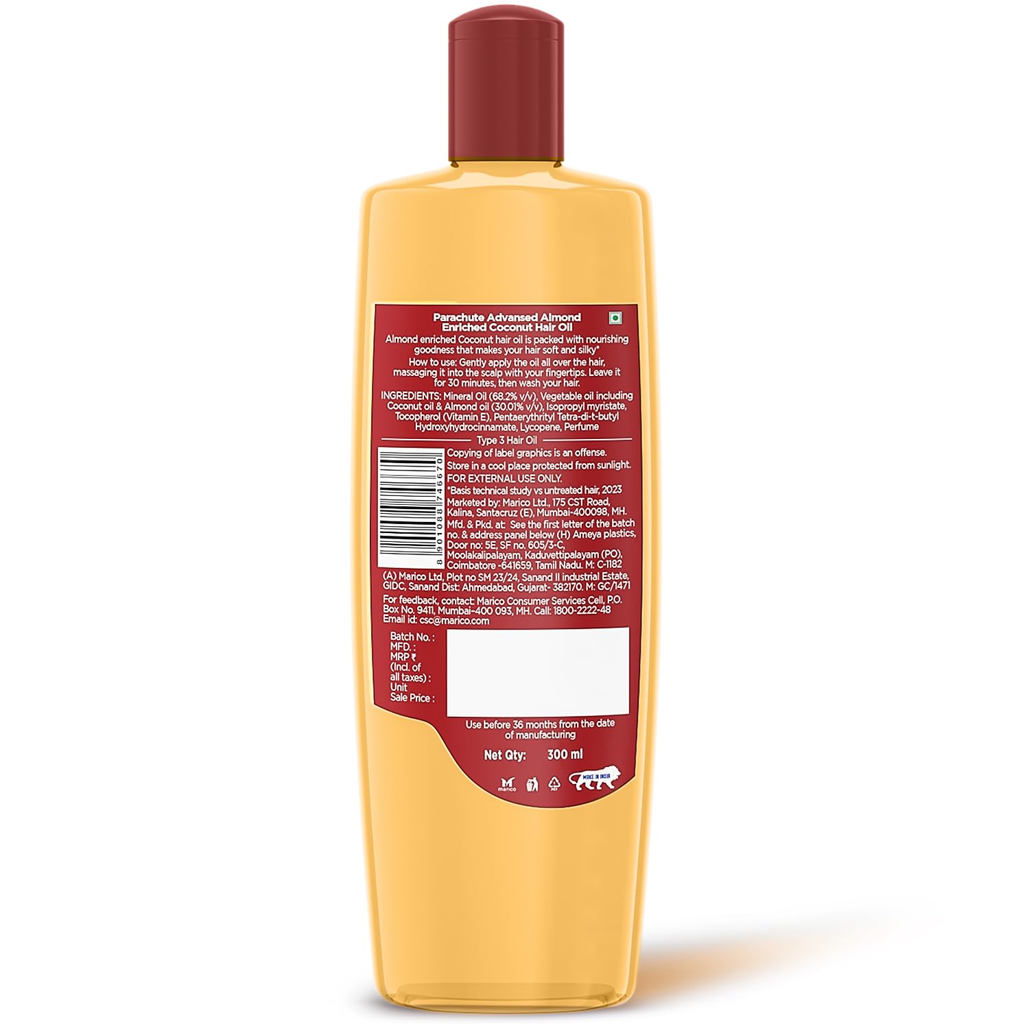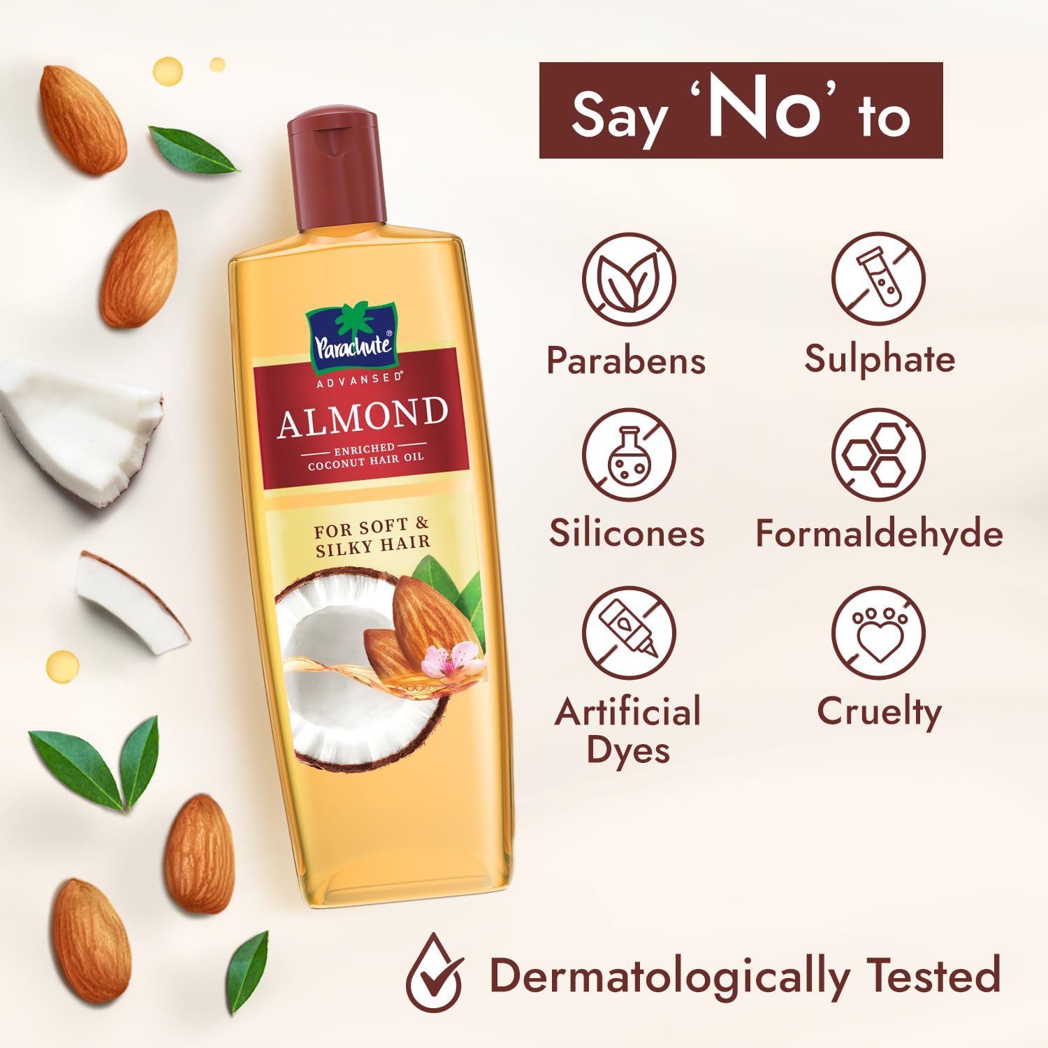 Silky soft hair dreams come true! It is the magic of Parachute Advansed Almond-enriched Coconut Hair Oil loaded with the goodness of two superfoods- coconut and almond. Rich in essential fatty acids and vitamin E almond and coconut hair oil deeply moisturises and conditions your hair making it 2X softer smoother and lustrous. Almond hair oil benefits your hair with improved scalp health reduced hair breakage and enhanced strength. The rich magnesium content in almond aids in preventing hair loss. The potent antioxidants protect your hair from damage caused by the environment while the oil's smoothness enhances styling without any harm. Bask in the natural shine and lustrous texture with the nourishing properties of almond and coconut hair oil that adds to the natural sheen and strength of your locks. Say Goodbye to split ends dryness and brittleness as this premium almond hair oil pampers and revitalises your locks. And that's not all. This wonder hair oil is perfect for treated hair too. So get set to experience delightful hair every day with the Premium Hair oil By Parachute Advansed.