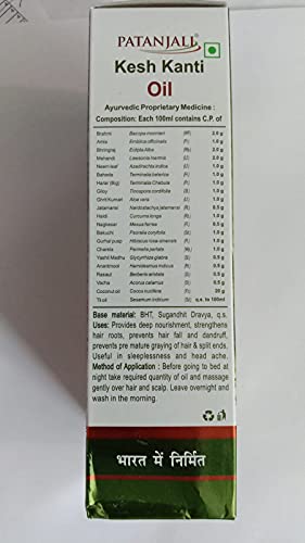 Patanjali Kesh Kanti Hair Oil provides deep nourishment and strengthens hair roots reduces hair fall and dandruff and prevents split ends and hair from greying. The regenerating mix of Wheat Germ Oil bhringraj sunflower oil and aloe vera calm the scalp reduces toxin build up and help hair become soft smooth and tangle free. The soft essences of the herbs used to aid in reducing sleeplessness and headaches.