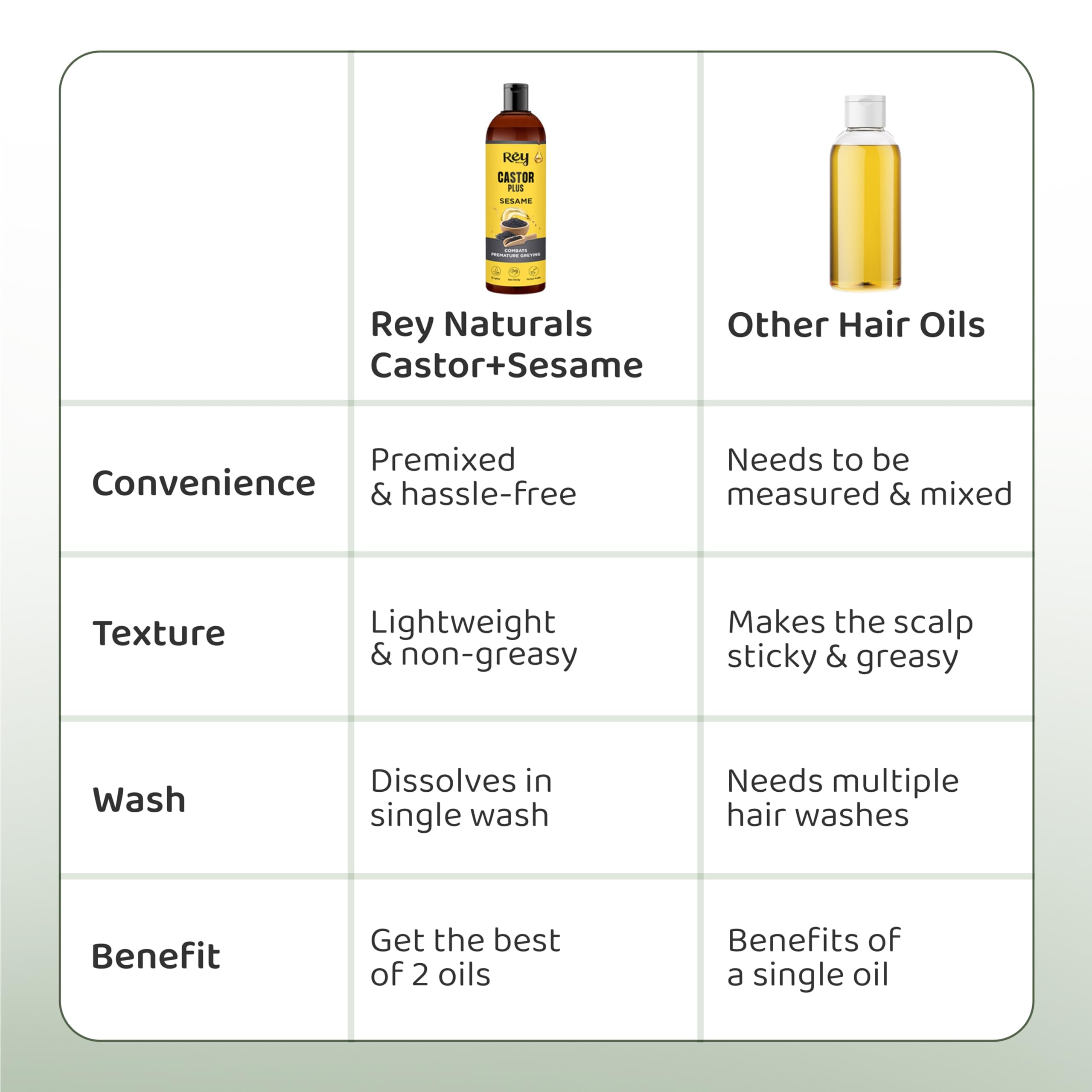 Enhances Healthy Hair & Strong Hair Follicles: Rey Naturals Castor Sesame Hair Growth Oil combines the nourishing properties of castor oil cold pressed and sesame oil to stimulate healthy hair and strengthen hair strands. Regular use of this hair oil boos