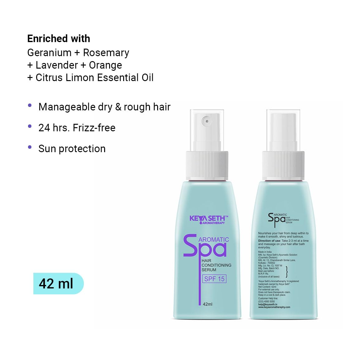 key a seth aromatherapy products an essential oil enriched hair serum that restores dry damaged hair protects from environmental extremities. Regular use of aromatic spa hair conditioning serum brings back smoothness lustre and health to weak frizzy dry damaged hair. Direction of Use: take two to three spritz of the aromatic spa hair conditioning serum on your palm depending on the hair length volume. Apply onto your clean dry or semi dry hair from root to tip. Leave on. It can also be used with premium hair spa for weak hair. Direction of Use: take two to three spritz of the aromatic spa hair conditioning serum on your palm depending on the hair length & volume. Apply onto your clean & dry or semi dry hair from root to tip. Leave on. It can also be used with premium hair spa for weak hair.