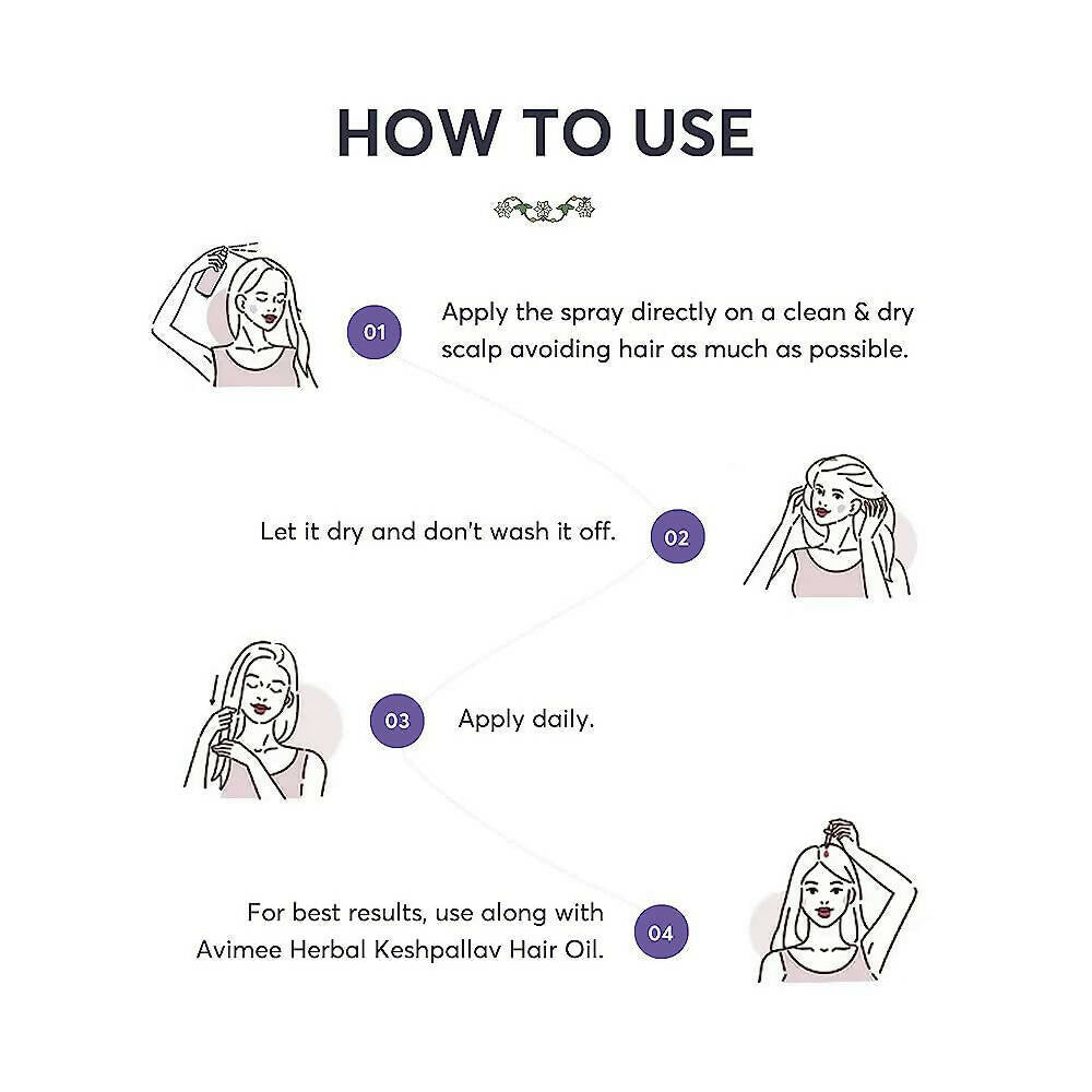Avimee Herbal Hair Tone Pv 1 Scalp SprayAbout the Product:Reduces Hair Fall & Makes Hair Strong: Avimee Herbal Hairtone PV 1 Scalp Spray contains extracts of herbs like Fenugreek, Curry Leaves, Bhringraj & Amla which make hair strong and hair loss.Promotes Hair Growth: Avimee Herbal Hairtone PV 1 Scalp Spray contains extracts of herbs like Fenugreek, Curry Leaves & Bhringraj which provides essential nutrients to hair for hair growth.Helps Reduce Dandruff: Avimee Herbal Hairtone PV 1 Scalp Spray contains extracts of herbs like Fenugreek and Curry Leaves which help fight dandruff.Contains Natural DHT Blocker: Avimee Herbal Hairtone PV 1 Scalp Spray contains extracts of herbs like Saw Palmetto which is a natural source of DHT blocker.Directions of Use:Apply spray directly on the scalp, Let it dry and don't wash it off. Apply daily for better results, use along with Avimee Herbal Kesh Pallav Hair Oil.Legal Disclaimer: Product images are for illustrative purposes only. Images/packaging/ labels may vary from tim
