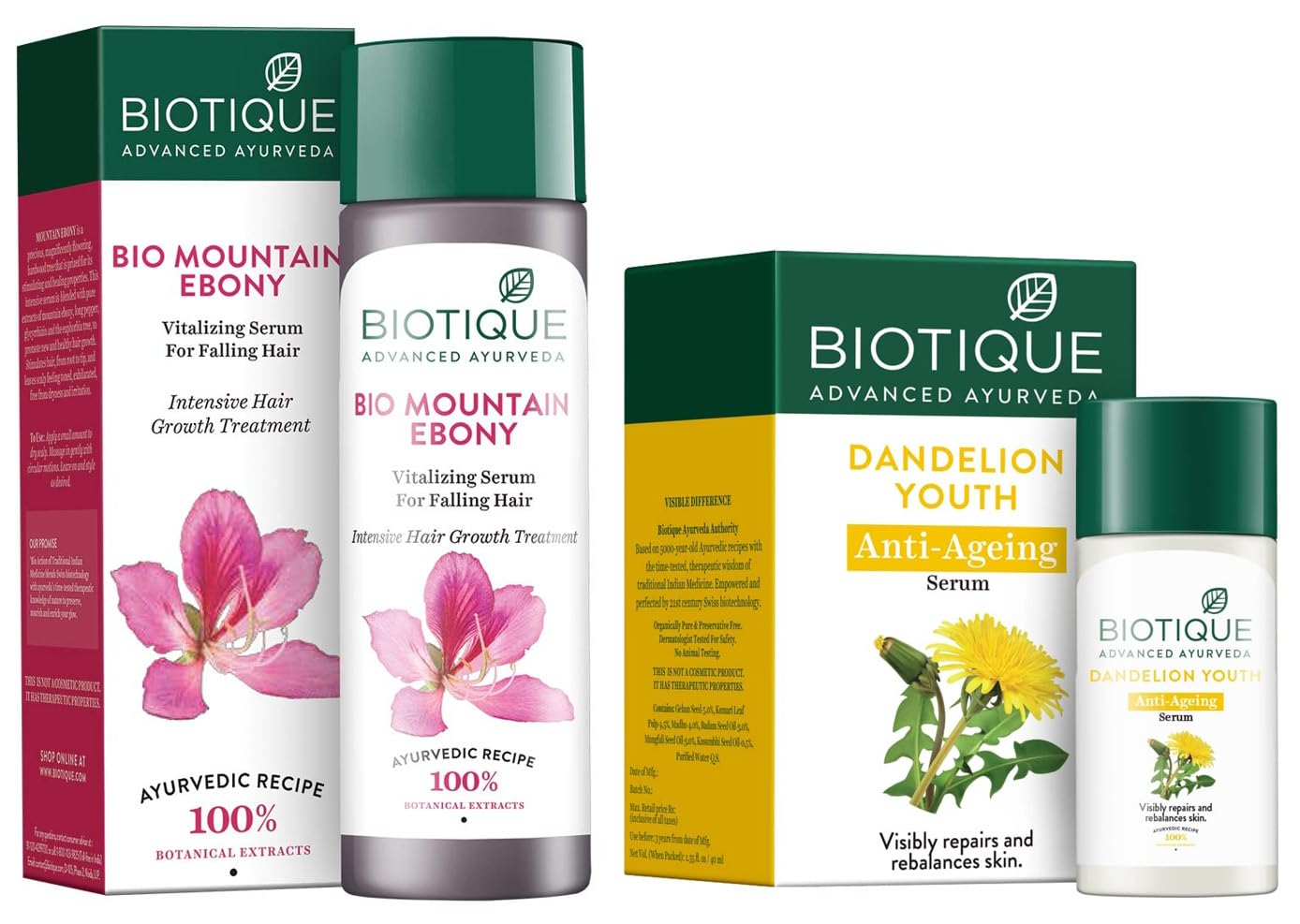 Biotique Bio Mountain Ebony Vitalizing Serum For Falling Hair Intensive Hair Growth Treatment 120MLStimulates hair from root to tip and leaves scalp feeling toned exhilarated free from dryness and irritation. It does not make hair greasy.Biotique Bio Dandelion Visibly Ageless Serum 40 mlThis ligtening serum is a rare combination of pure dandelion rich in Vitamin E and minerals blended with nutmeg oil. Used regularly it helps brighten skin fade dark spots and ease away wrinkles for a flawless complexion.