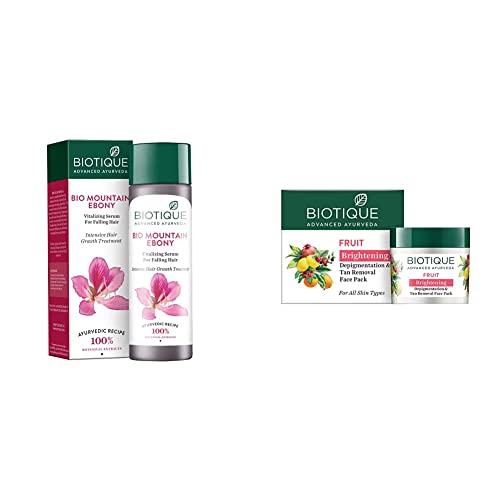 Biotique Bio Mountain Ebony Vitalizing Serum For Falling Hair Intensive Hair Growth Treatment 120MLStimulates hair from root to tip and leaves scalp feeling toned exhilarated free from dryness and irritation. It does not make hair greasy.Biotique Bio Fruit Whitening And Depigmentation & Tan Removal Face Pack 75gThe juices of Pineapple Tomato Lemon and Papaya fruit leave your skin clear youthful and fresh. It keeps away sun tan and skin blemishes. Every day use helps to make skin fairer and firmer.