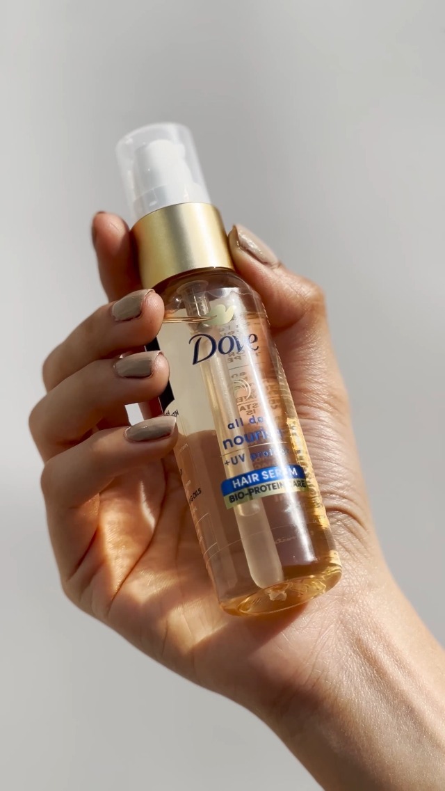 Introducing Dove all day nourish + UV protect hair serum - infused with Bio-protein care nourishing oils(olive oil almond oil apricot oil) and UV shield. Each drop of this potent formula delicately wraps your hair softly. Hair looks nourished soft and smooth for upto 48 hours. The lightweight yet rich formula helps protects from UV damage. For the first time in India Dove unveils BIO-Proteins. BIO-Proteins are similar to the proteins naturally present in your hair. UV shield infused serum formula is able to resist UV damage. Almond oil olive oil apricot kernel oil are the nourishing oils that are further added to the new Dove serum. Pump out 1-2 times on your palm. Rub your hand together and gently run through your hair wrapping each hair with dove's gentle care.The result? Hair that looks nourished soft and smooth. What's more it's free from sulphates parabens and dyes and proudly sports a PETA-certified cruelty-free badge. Dove serum is a versatile serum. It can be used post wash on damp hair for upto 48 hour nourished feel. It also works beautifully with dry hair as it instantly tames frizz smoothens and reduces tangles. When used with styling tools it effectively protects you hair from 230 OC heat.
