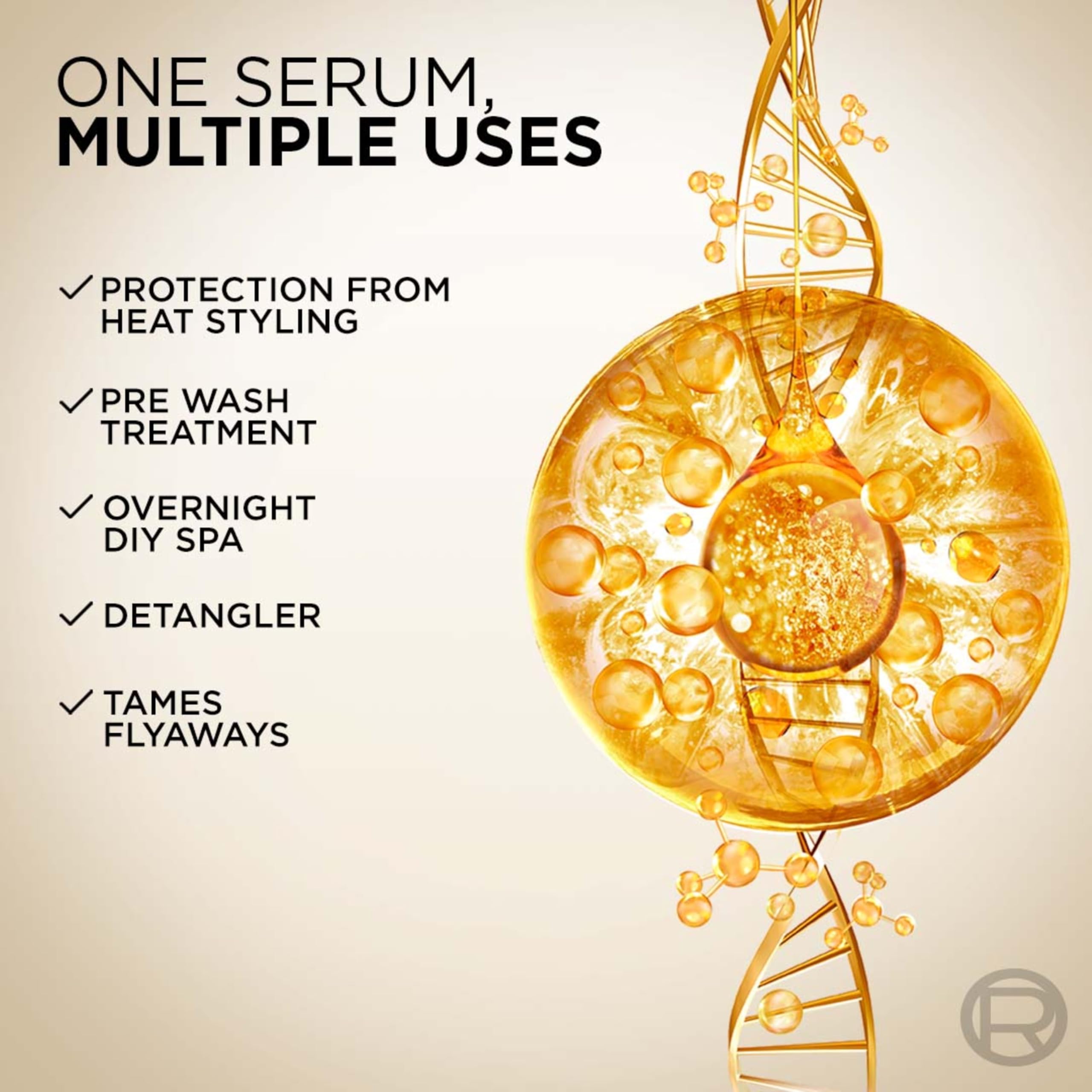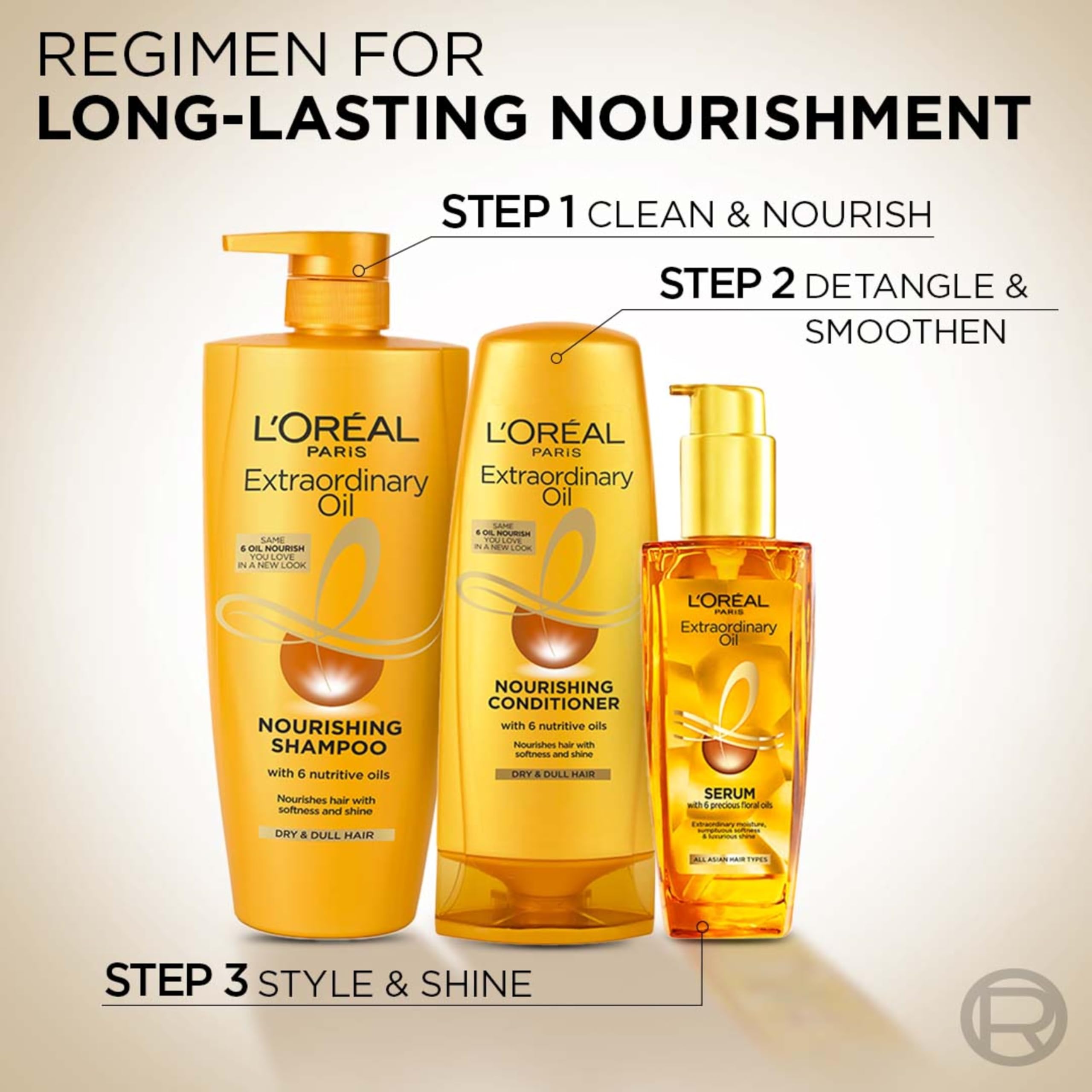Design:Oil Serum (100 ml)New L'Oreal Paris extraordinary oil serum tired of unmanageable dull hair and frizzy hair? Introducing the L'Oreal Paris extraordinary oil serum a luxurious multi-use hair serum that will give your hair a complete transformation! This Leave-in hair treatment leaves you with extraordinarily soft smooth frizz free and shiny hair. The light-weight formula of the extraordinary oil serum comes from cyclopentasiloxane present in the serum that provides deep hair nourishment without weighing it down. Infused with a blend of 6 rare flower oils - including sunflower oil (helianthus annuus) lotus flower oil flax plant/flower oil cocos nucifera oil matricaria flower extract and German chamomile extracts (bisablol and Chamomilla recutita extract). also experience the goodness of traditional coconut oil for your hair (including the benefits of caprylic acid) and soybean oil; that helps in extreme moisture retention! The L'Oreal Paris extraordinary oil serum is also a multi-use miracle oil that can be used in a variety of different ways: 1. Use before or after shampoo 2. Use as a serum for hair straightening 3. Use to provide hair protection before hair styling 4. Or use as an overnight hair treatment because the nourishing L'Oreal hair serum is truly versatile!.