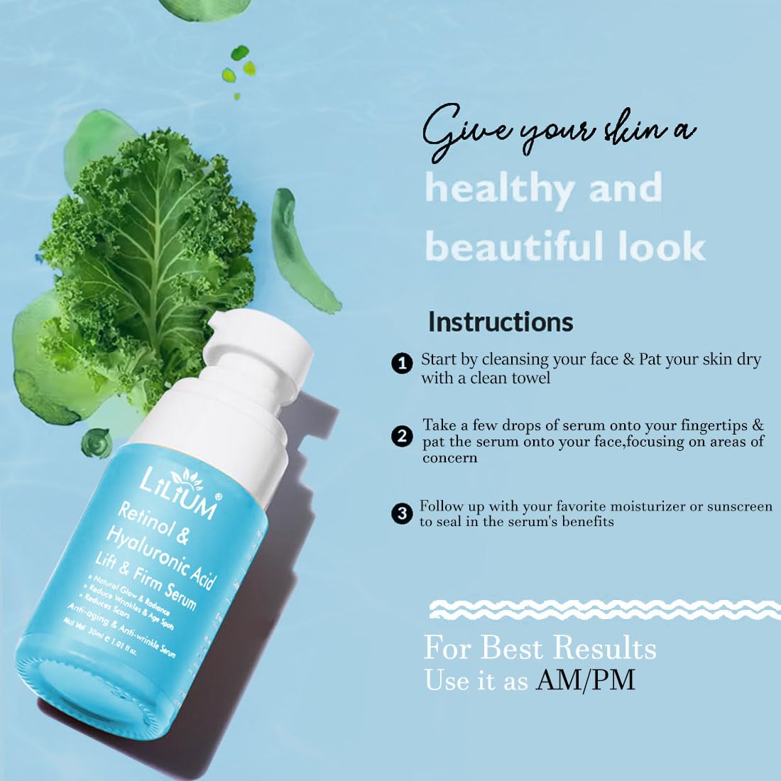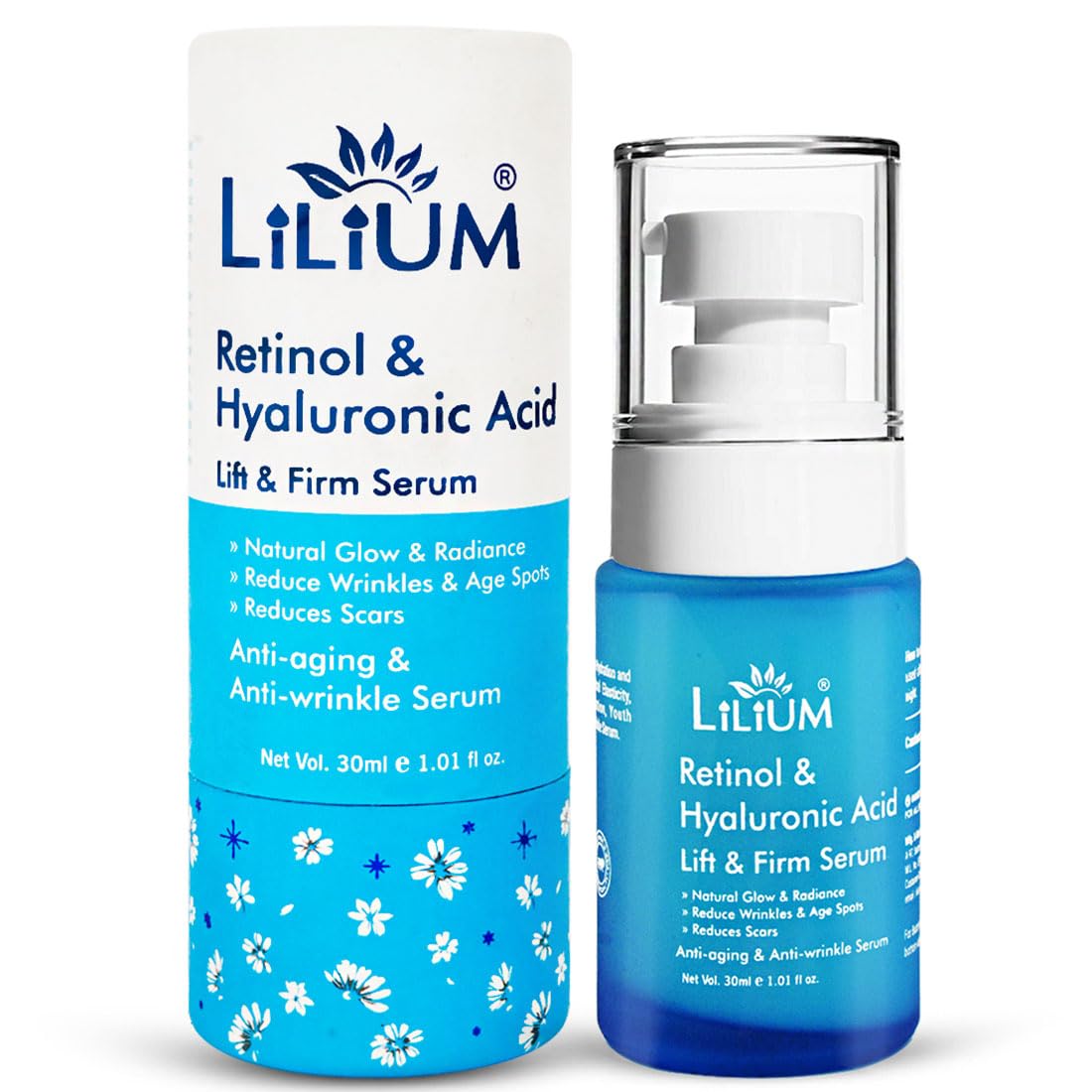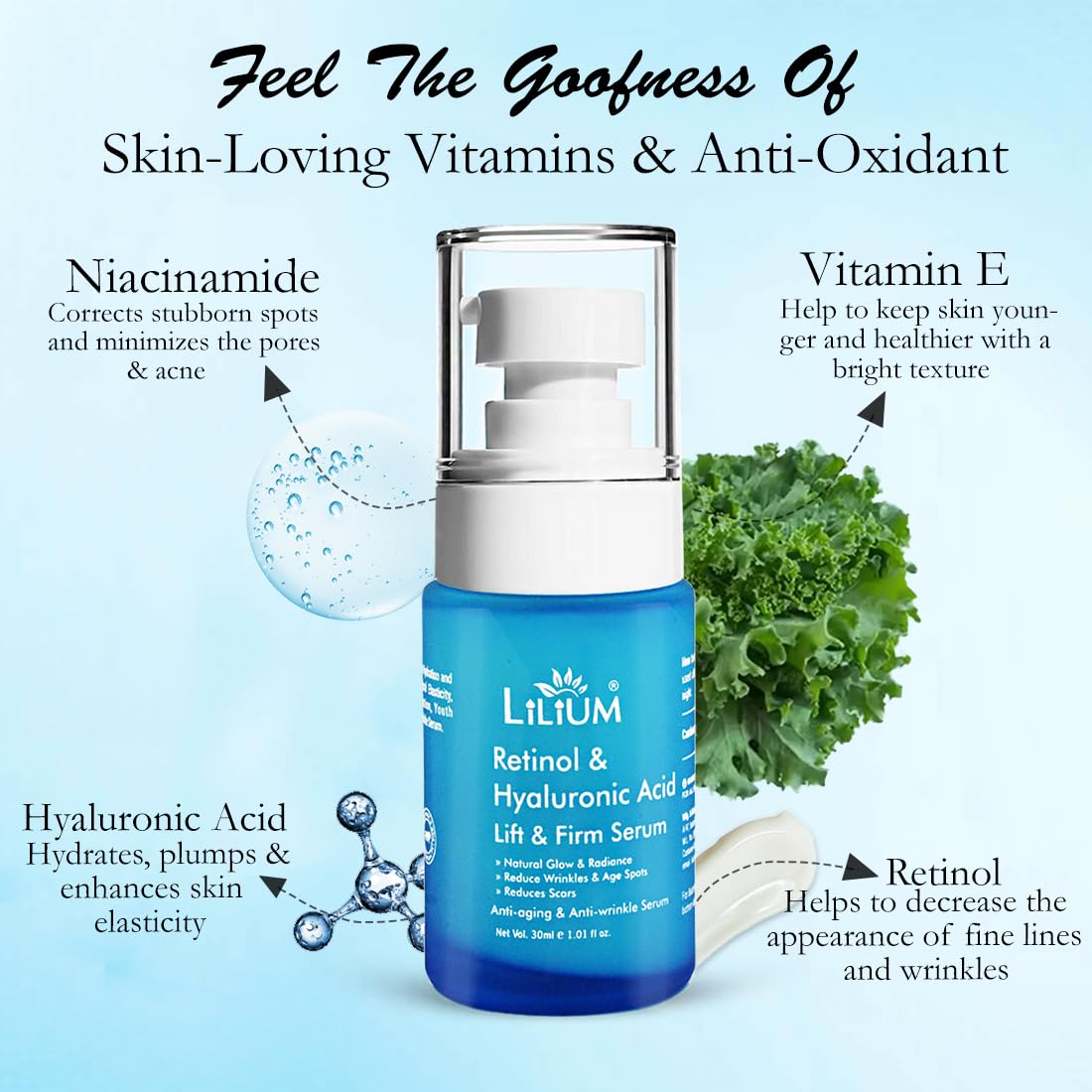 Unlock youthful radiance with Lilium Retinol & Hyaluronic Face Serum. This potent blend combines the rejuvenating power of retinol with the hydrating benefits of hyaluronic. Smooth away fine lines and wrinkles while plumping and moisturizing your skin for a fresh glowing complexion. Say hello to smoother firmer skin with our transformative serum. Harnessing the power of advanced skincare science this potent serum delivers transformative results for your complexion Our serum helps to diminish the appearance of wrinkles locks in moisture leaving your skin plump supple and intensely hydrated.