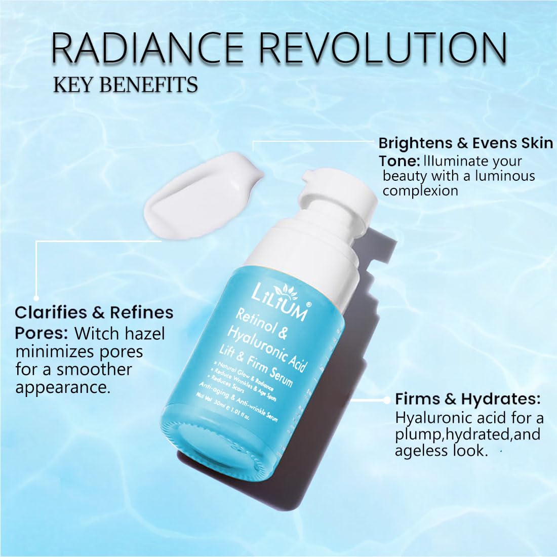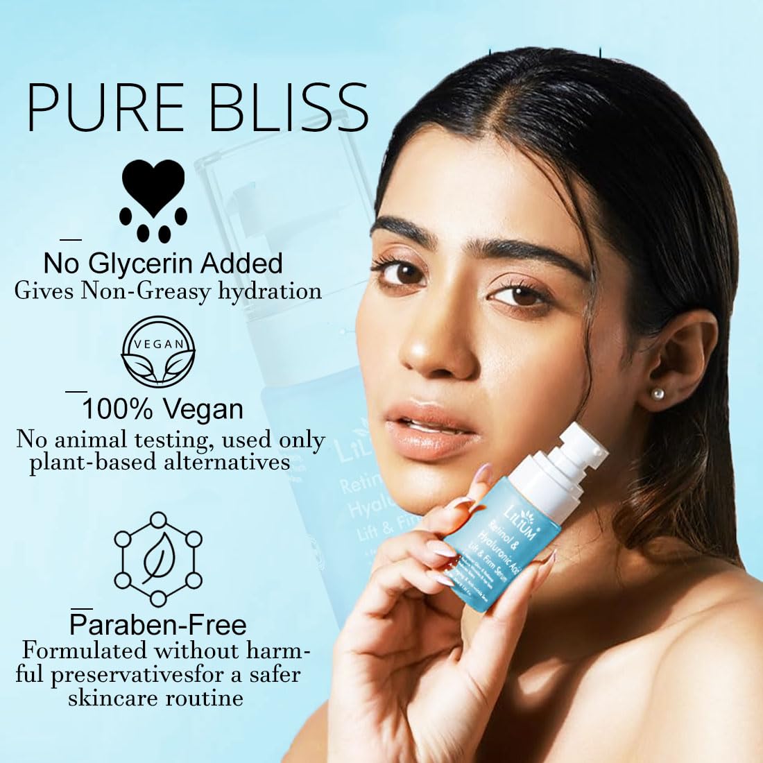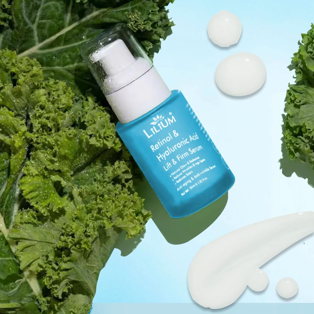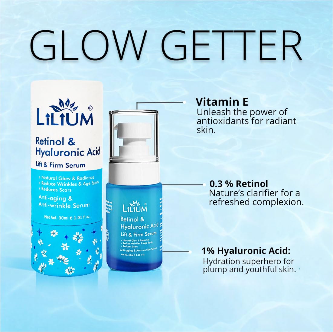 Unlock youthful radiance with Lilium Retinol & Hyaluronic Face Serum. This potent blend combines the rejuvenating power of retinol with the hydrating benefits of hyaluronic. Smooth away fine lines and wrinkles while plumping and moisturizing your skin for a fresh glowing complexion. Say hello to smoother firmer skin with our transformative serum. Harnessing the power of advanced skincare science this potent serum delivers transformative results for your complexion Our serum helps to diminish the appearance of wrinkles locks in moisture leaving your skin plump supple and intensely hydrated.