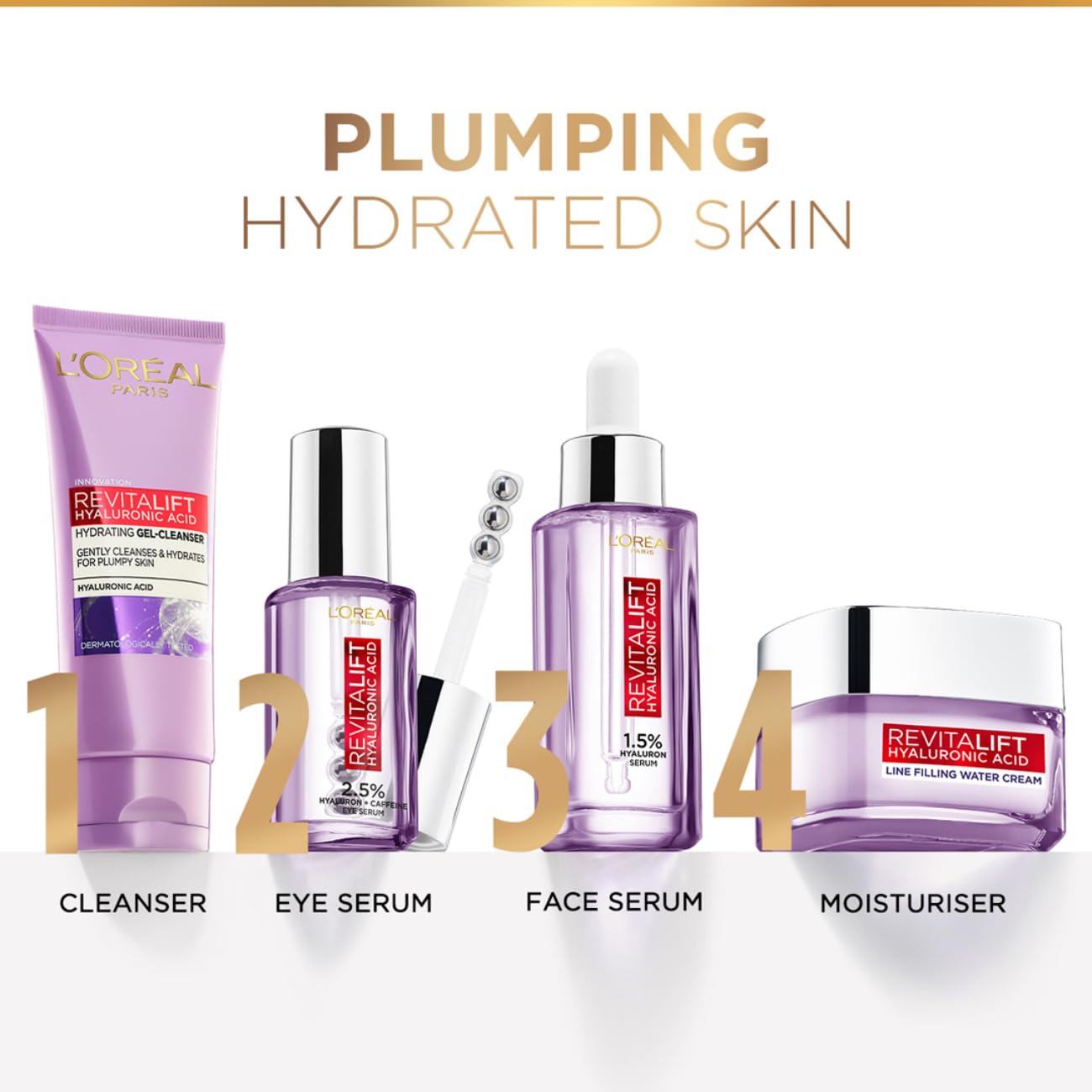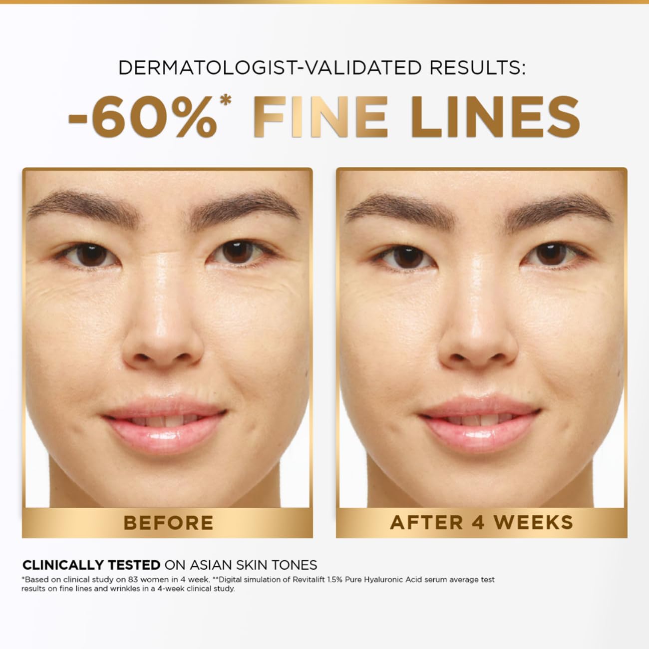 THE #1 Face Serum In the World* does what it says! The L'Oreal Paris Revitalift Hyaluronic Acid Serum with 1.5% Hyaluron has micro hyaluronic acid for deeper penetration. It intense hydrates and reduces fine lines by -60%*. With this lightweight and non-sticky serum get visibly youthful skin! Dermatologically tested it is suitable for all skin types and can be used daily. This face serum for women is paraben- free fragrance-free & alcohol-free. And suitable for all skin types including sensitive skin. For best results use the hyaluronic acid cleanser follow by this serum followed by the hyaluronic acid plumping cream morning and night. Disclaimers: n°1 sell - out sales volume and value based on nielseniq rms data for the female face care anti-aging serum category total retail market 23 countries 75% of world gni jan 2021 to dec 21 (copyright © 2021 nielseniq)” **basis instrumental test