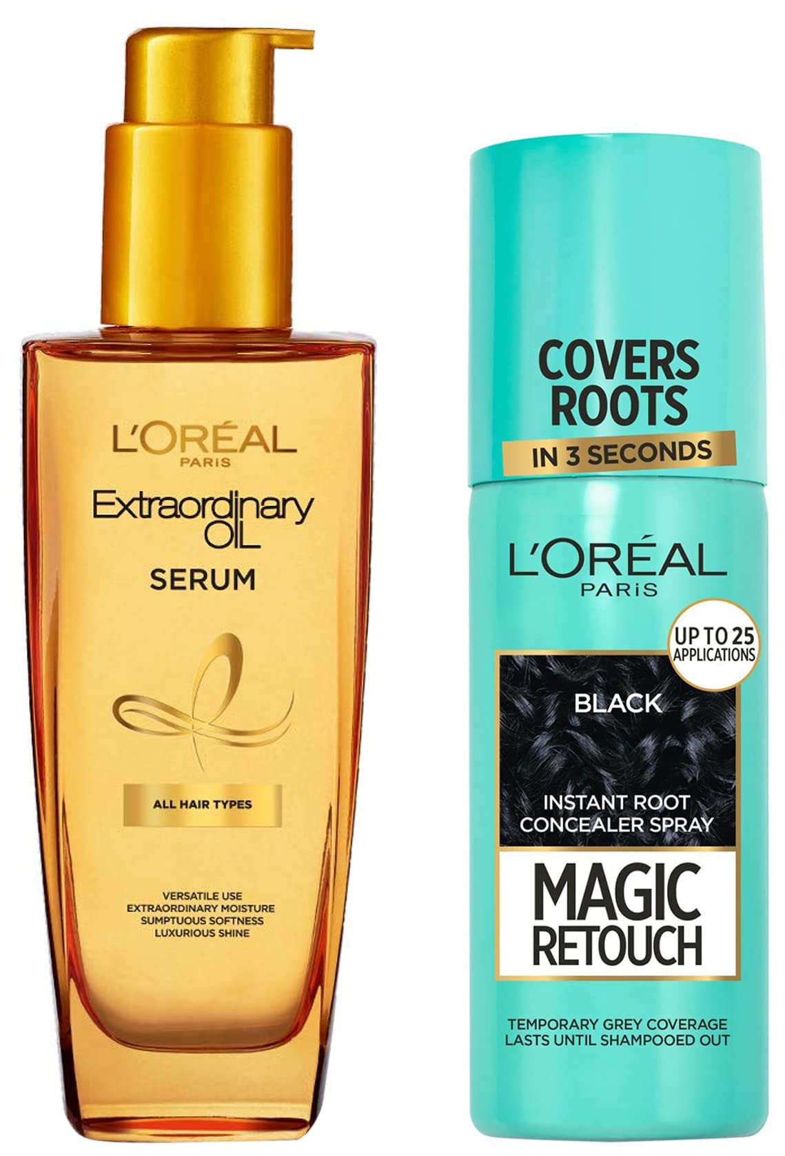L'Oreal Paris Extraordinary Oil Hair Serum for Women and Men 100 mlNew L'Oreal Paris extraordinary oil serum tired of unmanageable dull hair and frizzy hair? Introducing the L'Oreal Paris extraordinary oil serum a luxurious multi-use hair serum that will give your hair a complete transformation! This Leave-in hair treatment leaves you with extraordinarily soft smooth frizz free and shiny hair. The light-weight formula of the extraordinary oil serum comes from cyclopentasiloxane present in the serum that provides deep hair nourishment without weighing it down. Infused with a blend of 6 rare flower oils - including sunflower oil (helianthus annuus) lotus flower oil flax plant/flower oil cocos nucifera oil matricaria flower extract and German chamomile extracts (bisablol and Chamomilla recutita extract). also experience the goodness of traditional coconut oil for your hair (including the benefits of caprylic acid) and soybean oil; that helps in extreme moisture retention! The L'Oreal Paris extraordinary oil serum is also a multi-use miracle oil that can be used in a variety of different ways: 1. Use before or after shampoo 2. Use as a serum for hair straightening 3. Use to provide hair protection before hair styling 4. Or use as an overnight hair treatment because the nourishing L'Oreal hair serum is truly versatile!.L'Oreal Paris Instant Root Concealer Spray Magic Retouch Root Touch up (Pack of 1)- 2 Dark BrownGrey hair? Need a quick touch up? No time to colour those grey roots? Introducing the new L'Oreal Paris Magic Retouch the first instant root touch up spray that cover grey roots giving you a flawless and natural look in just 3 seconds. It is effortless smudgeless and damageless with a quick dry formula. The spray is a temporary hair colour and lasts till the next wash. Magic Retouch by L'Oreal Paris is the perfect solution for concealing greys and roots with one quick spray. The pinpoint micro diffuser precisely targets greys and the rich colour pigments give you perfectly blended coverage. L'Oreal Paris Magic Retouch is an instant root concealer spray that covers grey roots in just one quick spray when where and how you need it. Find your shade today!.