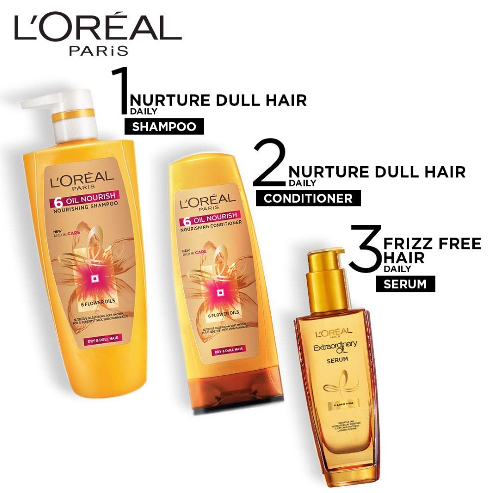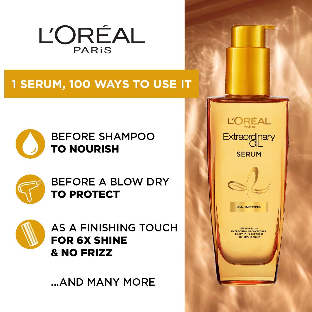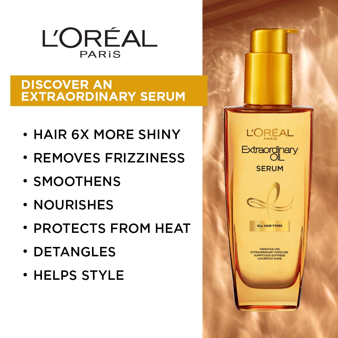 Transform and tame your unruly locks with our enriching Extraordinary Oil Serum! L'Oréal Extraordinary hair serum is designed to smooth and nourish dry frizzy and unruly hair. Enriched with a blend of 6 rare flower oils: Lotus Chamomile Flax Tiare Rose and Sunflower; hair is left looking smooth shiny and less. Ultra versatile and luxurious; it can be used as a pre-shampoo heat protector styling serum and over-night deep conditioning !