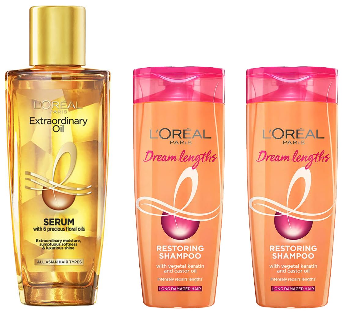 L'Oreal Paris Shampoo Nourishes Repair & Shine For Long and Lifeless Hair Dream Lengths 340 mlLonging for luscious lengths? Then dream no longer! L'Oreal Paris Dream Lengths conditioner is designed to hydrate and detangle damaged dry and over-processed long hair. Enriched with Keratin Vitamins B3 and B5 and Caster Oil; it leaves your locks looking shiny smooths split ends and protects from breakage.L'Oreal Paris Serum Protection and Shine For Dry Flyaway & Frizzy Hair With 6 Rare Flower Oils Extraordinary Oil 30mlTransform and tame your unruly locks with our enriching Extraordinary Oil Serum! L'Oreal Extraordinary hair serum is designed to smooth and nourish dry frizzy and unruly hair. Enriched with a blend of 6 rare flower oils: Lotus Chamomile Flax Tiare Rose and Sunflower; hair is left looking smooth shiny and weightless. Ultra versatile and luxurious; it can be used as a pre-shampoo treatment heat protector styling serum and over-night deep conditioning treatment!L'Oreal Paris Shampoo Nourishes Repair & Shine For Long and Lifeless Hair Dream Lengths 180mlLonging for luscious lengths? Then dream no longer! L'Oreal Paris Dream Lengths conditioner is designed to hydrate and detangle damaged dry and over-processed long hair. Enriched with Keratin Vitamins B3 and B5 and Caster Oil; it leaves your locks looking shiny smooths split ends and protects from breakage.
