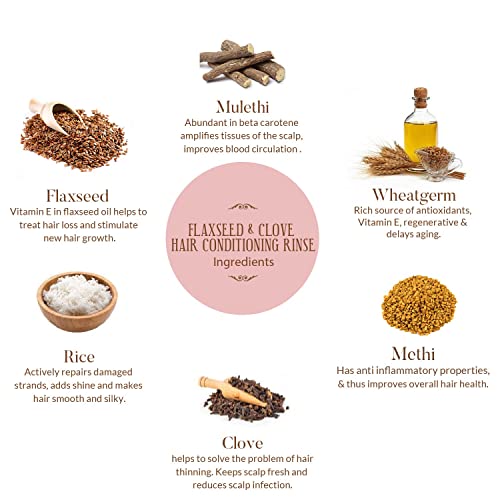 An intense hair conditioning rinse prepared with 100% natural ingredients. Enriched with hair nourishing nutrients.flaxseed is rich in fatty acids Vit B & E strengthens growth & minimizes the effect of free radicals on the scalp. Clove & Mulethi helps to improve blood circulation & locks moisture. Rice actively repairs damaged strands whereas methi is a rich source of protein & thus improves overall hair health.For better results Cleanse with honey & coconut milk hair cleanser or hydrate with moringa & ylang ylang hair serum.