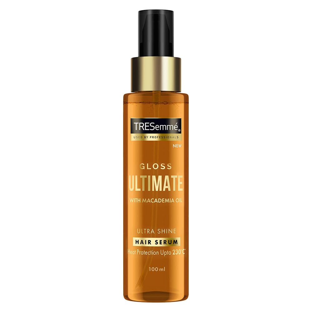 Gloss Ultimate Ultra Shine Hair Serum Salon style hair with super shiny finish Salon Quality TRESemme Gloss Ultimate Hair Serum is infused with Vitamin E and a blend of 3 powerful oils nourishing Coconut oil conditioning Macadamia Oil and moisturizing Sunflower Seed Oil provides glossy shine and deep nourishment to hair. It coats hair strands to give a salon smooth shiny finish at home. PRO TIP Before styling use Gloss Ultimate Hair Serum to protect hair from heat damage upto 230*C and make unruly hair more manageable. Transforming dull hair to stylish glossy hair. Use Gloss Ultimate Hair Serum before styling to: ⢠Boost Shine ⢠Nourish ⢠Detangle ⢠Protects from heat damage ⢠Adds smoothness Indulge in the luxury of long-lasting floral fragrance of this leave-in hair serum which lasts upto 48 hours* *Based on lab test vs non-conditioning shampoo A heat protect serum is must if you style your hair regularly or even occasionally. Styling tools for blow drying straightening or curling usually work at high temperatures which can cause damage to hair. TRESemme Gloss Ultimate Hair Serum helps protect hair from temperatures as high as 230*C Pick right dosage of hair serum for your hair type. It is ideal for fine to medium hair.