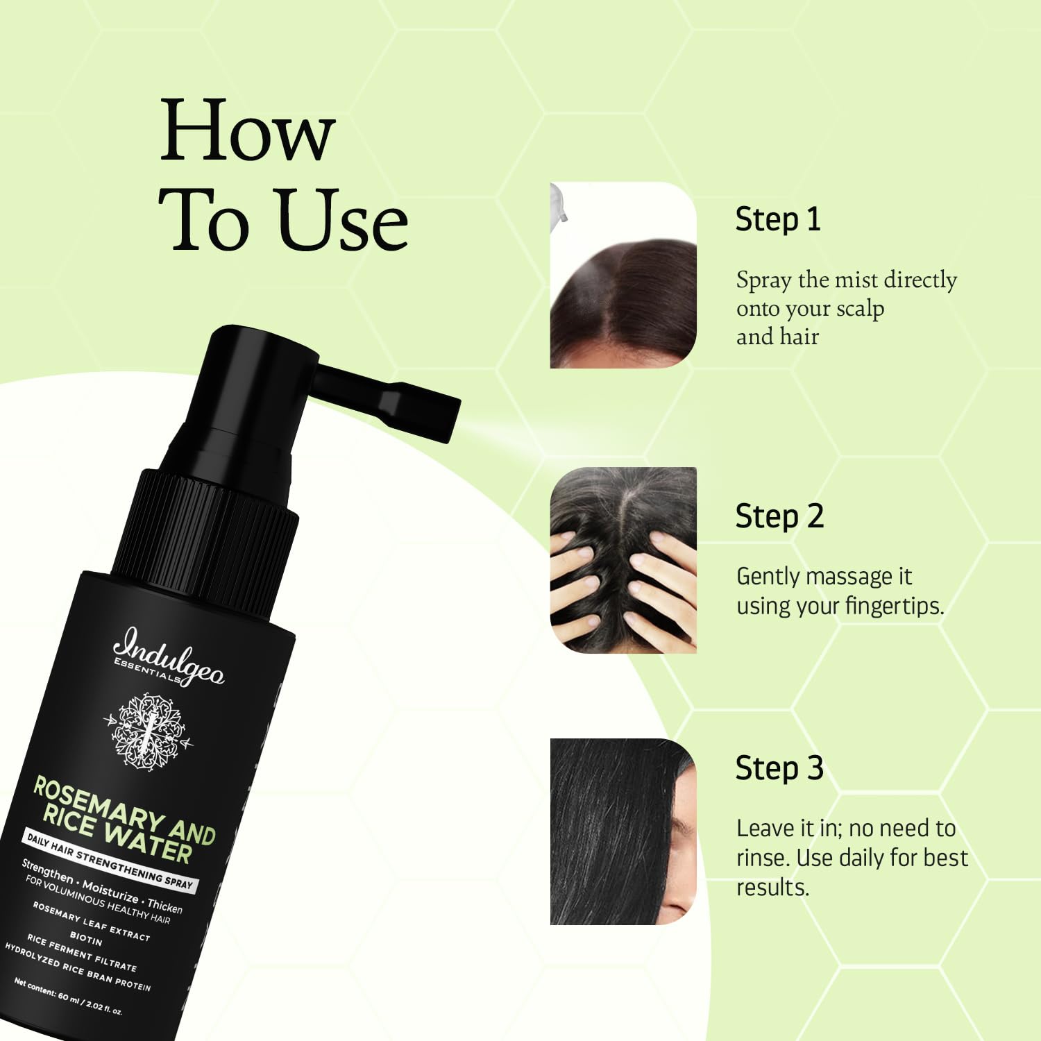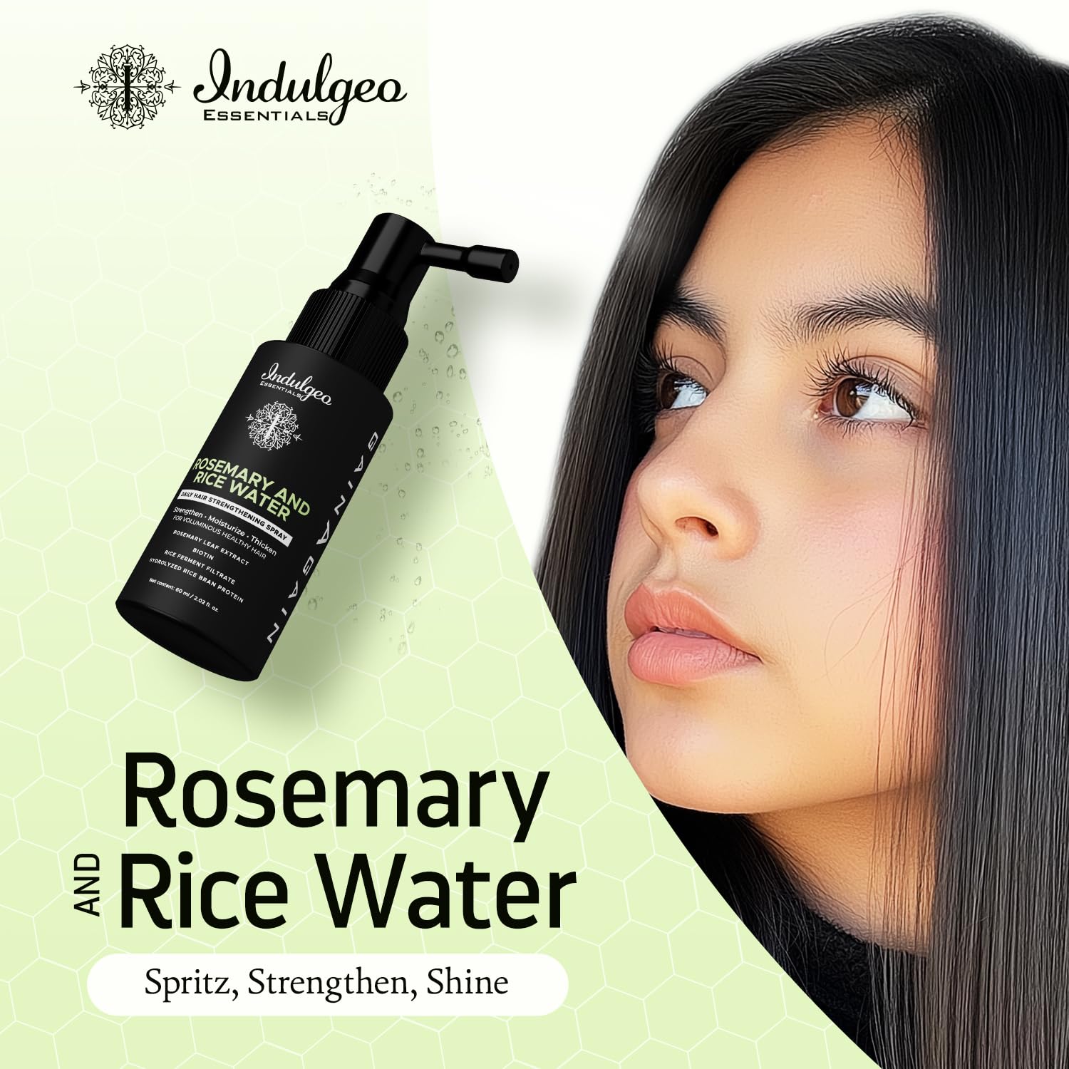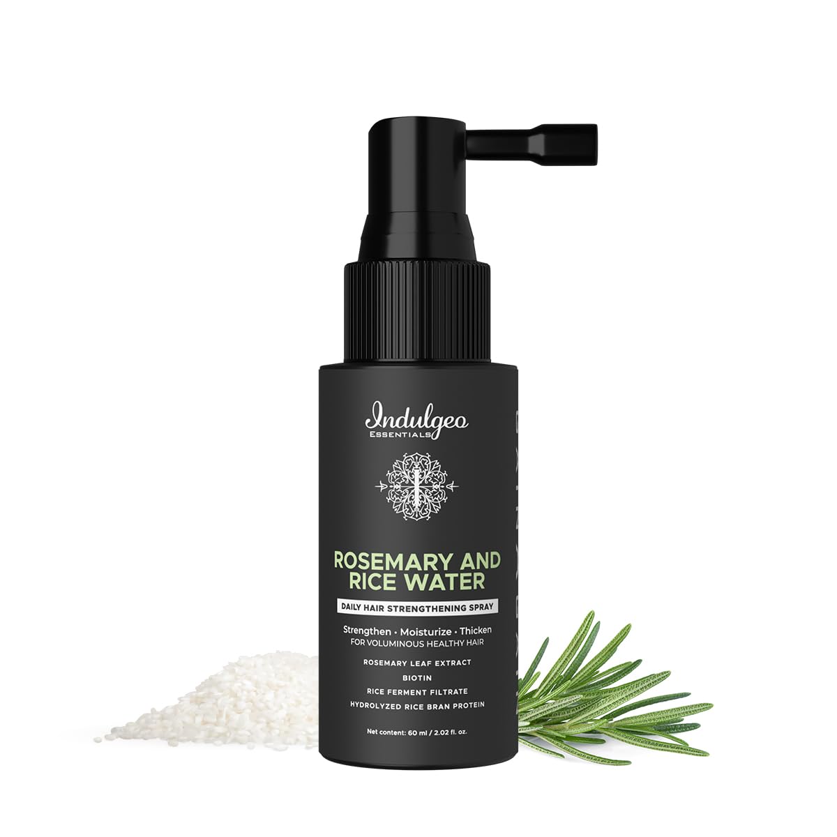 Indulgeo Essentials Rosemary & Rice Water Hair Growth Spray Mist (60ml) | Strengthen Moisturize Detangles Hair Shine Thicker & Healthier Hair
