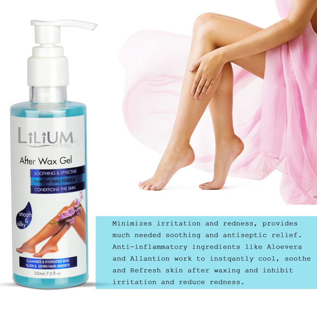 Good choice India provides new brand products. Lilium After Wax Gel Minimizes irritation and redness provides much needed soothing and antiseptic relief. Anti-inflammatory ingredients like Aloe-Vera and Allantoin work to instantly coolsoothe and refresh skin after waxing and inhibit irritation and reduce redness.