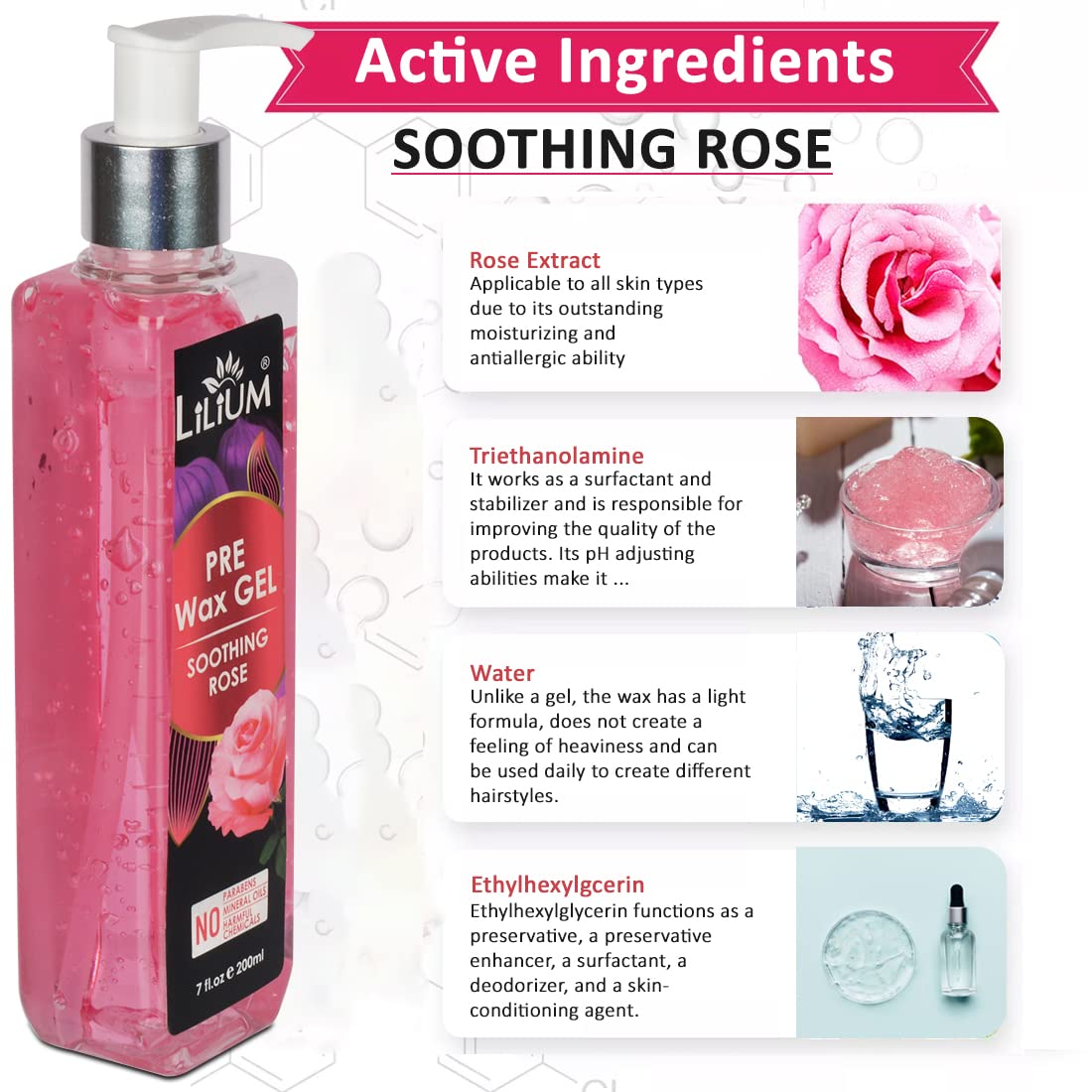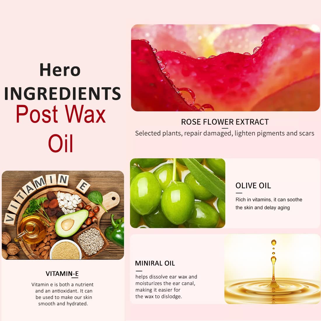 Pre Wax Gel: Contains natural ingredients like RoseAloe-Vera extract and Glycerinwhich cleans the area to be waxed perfectly and also improves the adherence of the wax.Recommended for all skin type .Post Wax Oil: A gentlenatural oilmade of natural ingredients with a high concentration of Olive Oil.Removes the wax residues and moisturizes the skin leaving it smooth when used after waxing.