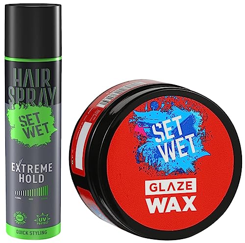 Set Wet Extreme Hold Hair Spray for Men Style-Spray-FreezeBottle 200 mlSet Wet hair spray for men - extreme hold styling hair spray is the perfect solution for a lasting hairstyle. Travel wind or even dancing wonât ruin it! Style your hair with any product and spray to freeze it in place so that your look doesnât change for hours. This hair spray for hair styling doesnât weigh down your hair or damage your hair either â it can be easily brushed off and you wonât experience any flaking. Style spray freeze & rock the dance floor - your hair will stay styled. Use a Set Wet Daily use Hair Gel or Set Wet Daily use Restylable Hair Wax to style you hair the way you desire now shake the bottle well and apply the spray in bursts so as to make sure you hair style freezes. This hair sprays is suitable for all hair types and do not add any extra weight to the hair and is suitable for all hair types and length. Set Wet hair spray for men - extreme hold styling hair spray is designed especially for quick drying without the formation of flakes and ca be easily brushed or washed offSet Wet Glaze Hair Styling Wax for Men 60 gmSet Wet Glaze is a hair styling wax for men who want to style their hair with a natural shine with the freedom to change it on-the-go. Made from a unique blend of ingredients it keeps hair soft enough so you can re-style it throughout the day! Set Wet Glaze Hair styling wax for men is suited for all hair types and all hair lengths. Set Wet Glaze Hair styling wax for men also allows for movement of your hair and hence also makes your hair look voluminous. This is a perfect wax for flaunting you hair style and carrying the party shine look throughout the day which appears to be natural. It would be hard to guess if you have applied anything on your hair. Set Wet waxes are made from unique blend of ingredients it keeps hair soft enough so you can re-style it throughout the day! Simply apply the product once and keep re-styling your hair throughout the day depending on your mood and the setting. Now go from your gym to your college or to your after party with impeccable hair style and confidence. Set Wet hair waxes for men will give you the desired look and the confidence to carry any hair style effortlessly and due to its ability of letting you restyle your hair so now you can always run you finger through your hair to give you hairstyle the finishing touch to make them look perfect and flawless anytime of the day."