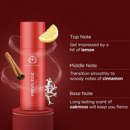 • LONG-LASTING FRAGRANCE: The Man Company Body Spray Privilege Intense delivers a long-lasting freshness that keeps you feeling stronger and bolder round the clock. Sparkling notes of Lemon Cinnamons & Oakmoss keep you refreshed whenever you apply it.