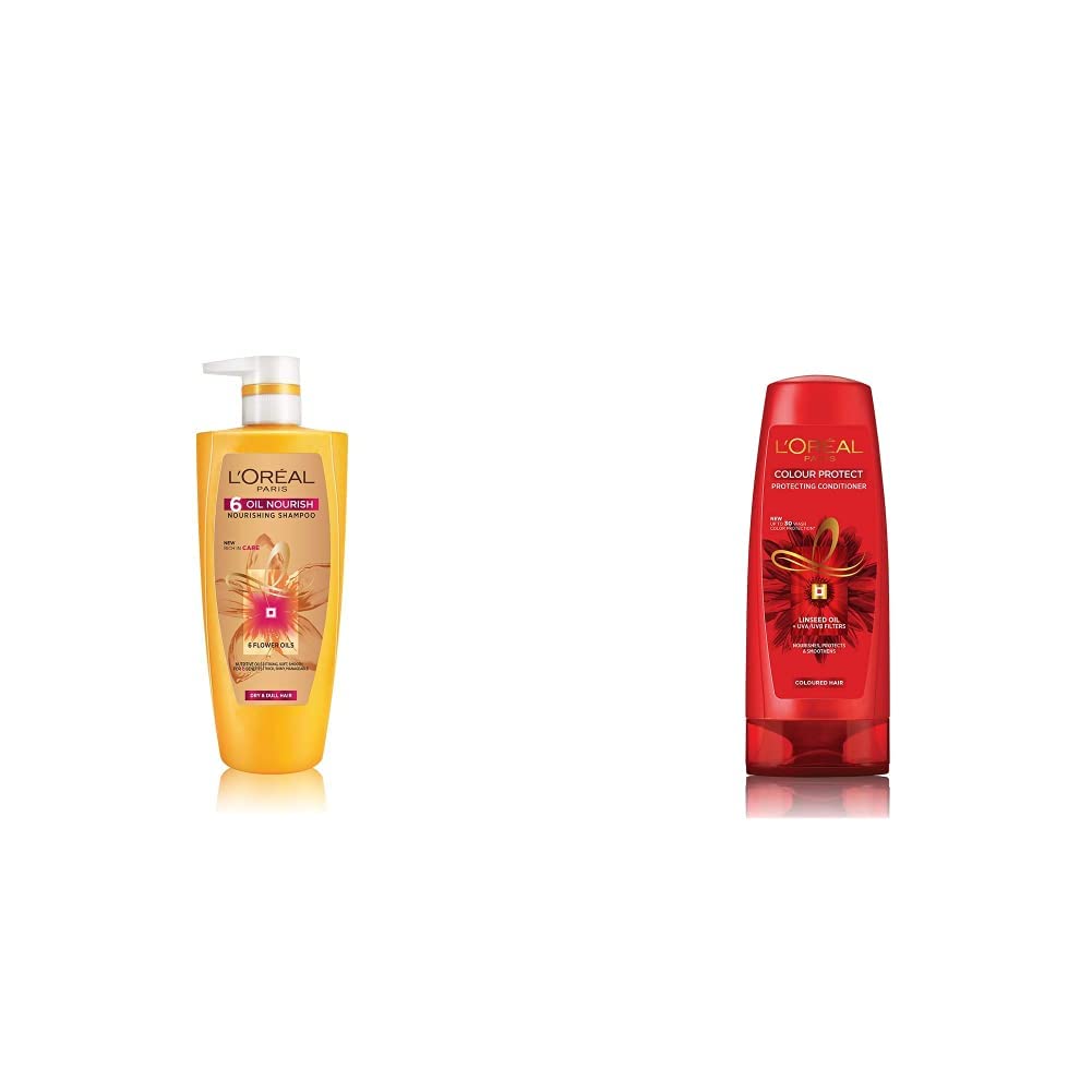 L'Oreal Paris 6 Oil Nourish Shampoo 640ml (With 10% Extra)L'Oreal Paris 6 Oil Nourish Shampoo has been created to provide complete nourishment to your hair from root to tip with six micro oilsoo¢ making it soft shiny thick strong smooth and manageable. Pamper your hair with the 6-Oil Nourish Shampoo personalized for your hair type. Science meets tradition with the infusion of 6 unique oils - Argan Almond Jojoba Olive Coconut and Camelina. Penetrates deep into the scalp giving it utmost nourishment and care that is suitable for all hair types. L'Oreal Paris helps to revive all forms of hair damage. Whether its from heat styling color processing or dryness L'Oreal Paris has powerful treatments formulated with superior technology.L'Oreal Paris Color Protect Conditioner 192.5ml (175ml+17.5ml)Colour Protect conditioner nourishes the hair and transforms its surface keeping the hair protected and prolonging the color radiance. The Colour Protect formula with UV filter- Light Reflecting System combines an active nourishing ingredient and filters for color treated hair. Dry hair meet your match. LOreal Paris offers hair conditioners for every concern and hair type. Whether youre looking to moisturize dry hair want a conditioner for colored hair or want to help repair damaged hair with a deep conditioner we have the hair conditionerand complementary shampoothat best fits your needs!.