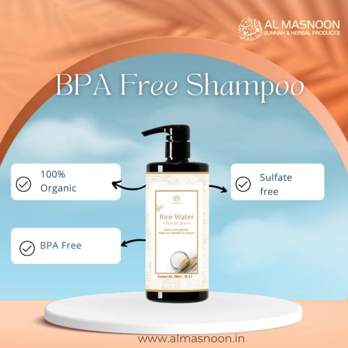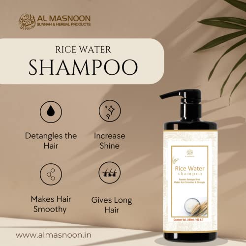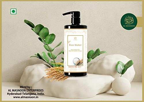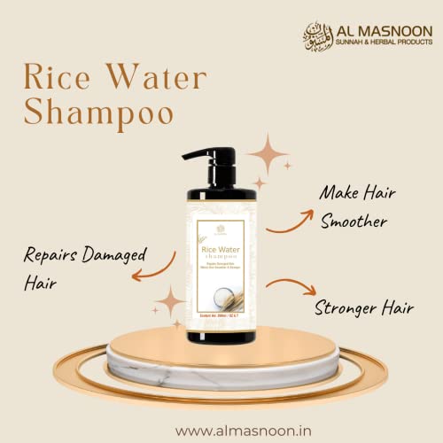 AL MASNOON Rice Water Shampoo 200ml makes the hair smoother and increases the shine and makes the hair stronger . RICE WATER is rich in vitamin. it helps in hair growth and improves elasticity. al masnoon Rice water shampoo contains vitamins and minerals that nourish the hair and scalp and may encourage growth. Rice water contains many antioxidants and vitamins which are beneficial for hair health and growth. the nutrients in rice water that can benefit your hair are folic acid niacin magnesium and inositol. It also contains amino acids that let it act as a protein treatment to strengthen and protect hair.