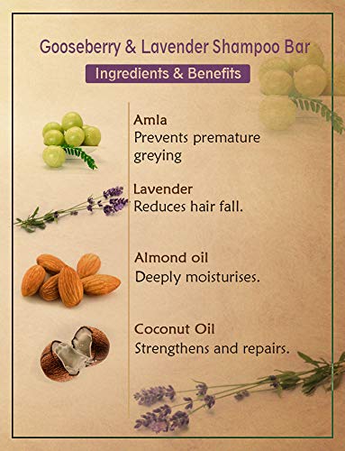 Ancient Living Gooseberry and Lavender Shampoo Bar gently cleanses out all the impurities stimulates hair growth and deeply conditions your hair. It is a storehouse of vitamins E and C which are known for their nourishing properties. Infused with gooseberry it treats a dry flaky and an itchy scalp. Lavender oil prevents hair loss and soothes your senses. Almond oil acts as a great conditioner making your soft and hydrated. Coconut oil strengthens and repairs your hair giving you beautiful lustrous locks. Application: Wet your hair and apply the shampoo bar directly on your scalp. Gently clean your hair by massaging it all over your scalp and rinse. Shampoo bars are a great environment-friendly option and help you save some bucks at the same time! Their minimal packaging and shape make it a zero waste alternative. Since they don't come in the liquid form like the traditional shampoos they last a long time. Their compact size and light weight make them perfect for travel! BENEFITS GOOSEBERRY POWDER · It cures hair loss. · It contains essential fatty acids which strengthen your hair and add luster. · The surplus of vitamin C in amla helps in preventing premature greying. · It conditions your hair and treats dandruff. · It treats a dry flaky and an itchy scalp and nourishes it from within. · It has a high iron content which stimulates hair growth. LAVENDER OIL · It promotes hair growth and reduces hair loss. · It controls baldness. · It exterminates lies from your hair. · Its anti-fungal properties keep scalp impurities at bay! · It treats dandruff and prevents premature greying of hair.
