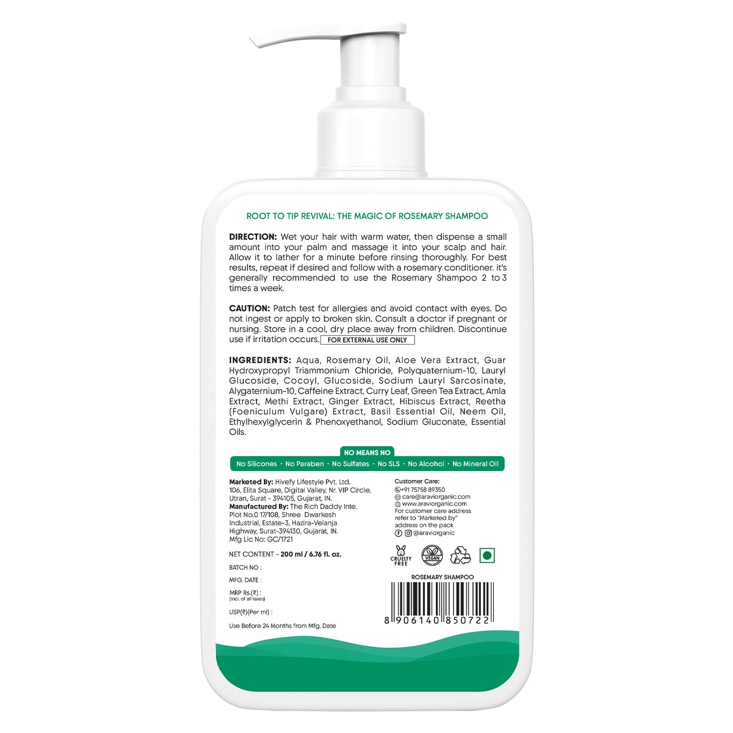 Aravi Organic Rosemary Anti-Hairfall Shampoo | Rosemary Shampoo for Hair Growth & Hairfall Control | Up to 94% Stronger Hair | Sulphate-Free for Men & Women | For All Hair Types | 200ml
