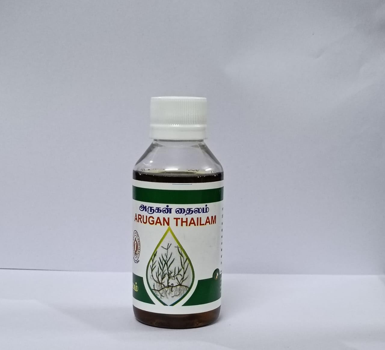 Arugan Thailam is mainly Made from âArugampulâ known as Bermuda Grass. Scientific Name is Cynodon dactylon . Arugan Thailam is a well-known remedy for diseases like Skin infections Dandruff Itching of skin Skin scars Hyperpigmentation of the skin Scabies Fungal infections. It has anti-inflammatory antimicrobial and antifungal properties. It is also thought to help promote wound healing. Benefits of Arugan Thailam: Bacterial skin infections: Bacterial skin infections often begin as small red bumps that slowly increase in size. Any bacterial infections are quickly treated with Arugan Thailam because they are mild. Dandruff: Dandruff is a skin disorder that mostly affects the scalp. Flaking and slight itchiness are common symptoms. It can lead to social or self-esteem issues. Itchy and flaking skin of the scalp are the symptoms of dandruff. Genetic and environmental factors can cause dandruff problems Itching of skin Prutitis of skin: The causes of skin itching also known as pruritis are typically safe. They are often associated with transient problems Many reasons are there for skin itching such as dry skin or a bug bite. Skin scars: After an injury a scar is a patch of fibrous tissue that covers natural skin. Scars form as a part of the cellular mechanism of tissue regeneration throughout the flesh as well as in other organs and tissues throughout the body. Hyperpigmentation of the skin: Hyperpigmentation is a natural normally harmless disorder in which patches of skin become darker than the surrounding skin. This darkening happens as an accumulation of melanin the brown pigment responsible for natural skin colour deposits in the skin. Direction for use: Apply Arugan Thailam on the affected areas as external application only or as directed by physician.