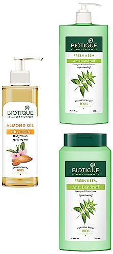 Biotique Bio Neem Margosa Anti Dandruff Shampoo and Conditioner 650mlThe product comes in safe package. The product will be an excellent pick for you.Biotique Almond Oil Ultra Rich Body Wash 200mlThis soothing cleanser is blended with nourishing almond safflower sesame neem and staff tree oils to dissolve heavy face and eye makeup easily and gently. Leaves skin silky-fresh.Biotique FRESH Neem Anti Dandruff Shampoo and Conditioner 340mlThis refreshing formula blends the natural sap of the margosa and euphorbia trees with the bhringraj herb to control dandruff. Eliminates the dryness flaking and itching associated with dandruff. Special ph balanced formula is gentle enough for use every day. Leaves hair fresh lustrous and full of natural body. An ancient herb rich in proteins Bhringraj is effective in adding a sheen to your mane. Used for centuries to treat dandruff Bhringraj prevents hair loss and targets premature greying.Reetha is an effective hair cleanser. It contains 'saponins' that is a natural surfactant.