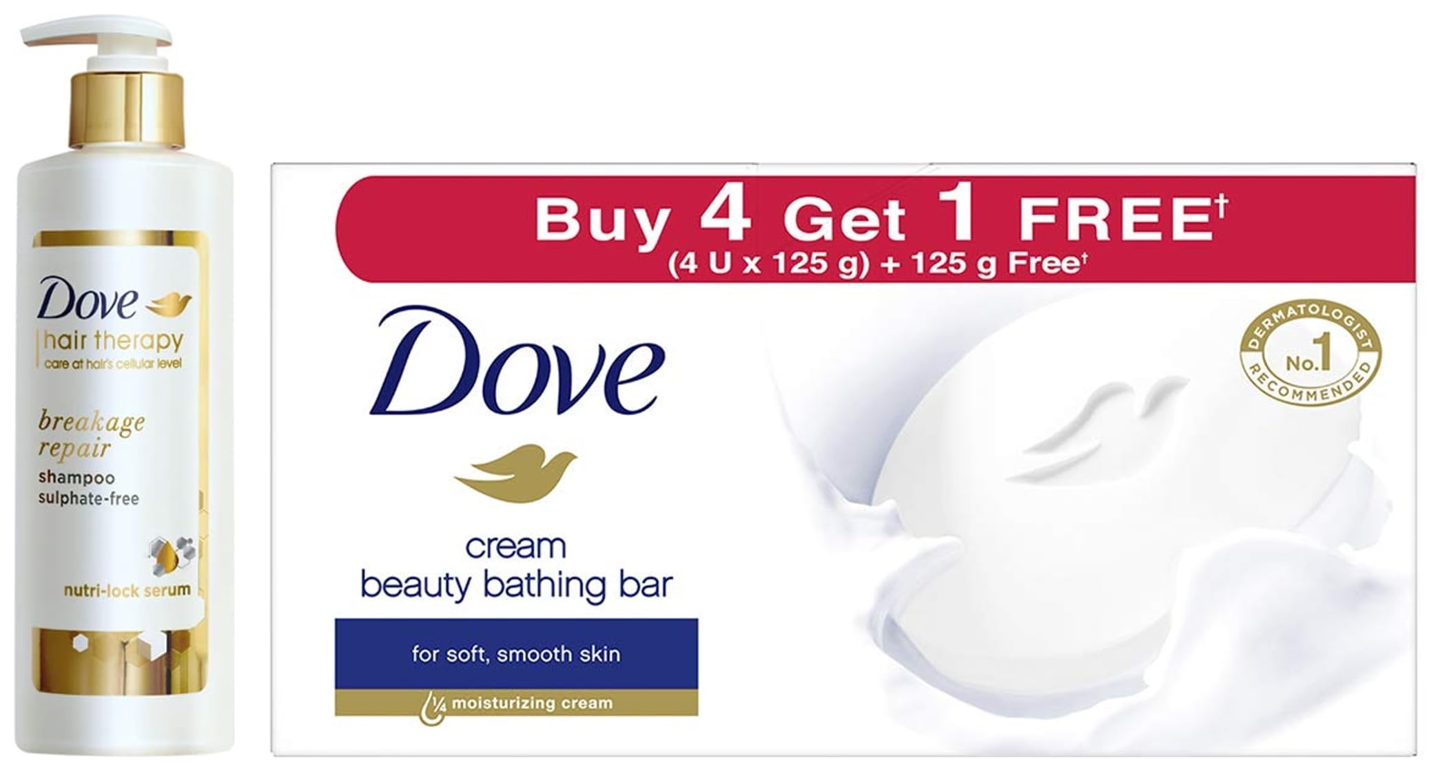 Dove Cream Beauty Bathing Bar 125 g (4+1 Free Combo) With Moisturising Cream for Softer Glowing Skin & Body - Nourishes Dry Skin more than Bar SoapDove Cream Bathing Beauty Bar combines a gentle cleansing formula with Doveâs signature ¼ moisturizing cream to give you softer smoother and more glowing skin with every shower.What makes Dove different? Doveâs beauty bars gently cleanse your skin and help retain its natural moisture rather than stripping it away. While ordinary soaps may leave your skin feeling dry and tight Dove cream Beauty Bar helps your skin maintain its natural moisture barrier and keep skin hydrated. Its moisturising and nourishing formula leaves skin soft smooth and glowing.Dove is the No.1 Soap Brand recommended by dermatologists. It is pH balanced and mild on skin making it suitable for all skin types. It has gentle cleansers which are suitable for dry and sensitive skin also. It cares for your skin and washes away germs. Regular soap may dry out your skin but the classic moisturizing formula of Dove bars will leave skin softer smoother and more glowing.For best results lather up your Dove Cream Beauty bathing bar and massage the smooth creamy lather over your face and body before rinsing thoroughly. Dove cares for skin and washes away germs.Try Dove And feel the Dove difference. Get soft smooth and glowing skin.Dove Hair Therapy Breakage Repair Sulphate-Free Shampoo No Parabens & No Dyes With Nutri-Lock Serum to Reduce Hair Fall for Thicker Looking Hair 380 mlWondering how to help make hair stronger and reduce hair fall all at once? Discover Dove Hair Therapy Shampoo expert care that reaches hairâs cellular level to repair damage with moisturising potion and nourishing ingredients. We are all about those good hair days â but hair fall can make us feel less than our beautiful best. That is why we had created Dove Hair Therapy Breakage Repair Shampoo for weak hair prone to breakage and falling. Giving your hair expert care it deserves this strengthening Shampoo blends all the care of Dove you know and love. Infused with Nutri-lock serum this shampoo for weak hair is inspired by the world of luxury skin care & science. It gives care at hairâs cellular level and boosts hair strength - helping your hair look thicker stronger and healthier. Our gentle formula is free from sulphate paraben and dyes which makes it suitable even for coloured hair. This caring shampoo is free from harsh chemical based cleansers such as SLS/SLES. Try it today for beautiful healthy-looking hair with 98% less breakage**. For best results use with Dove Hair Therapy Breakage Repair Conditioner and Breakage Repair Leave-on solution.**When used as a system vs. non-conditioning shampoo