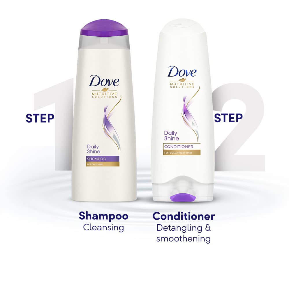 DETANGLES HAIR GIVING IT AN UNBELIEVABLE SHINETangles and frizz not only make hair look dull but can also lead to increased hair breakage while combing. That's why shampoo alone is not enough. Use Dove Daily Shine Conditioner everytime after shampoo for detangled smooth hair with an unbelievable shine. Infused with Nutritive serum it detangles hair along the lengths adding shine taming frizz and making hair so smooth that your comb will slide through. After applying shampoo wash your hair and rinse out excess water. Then follow below 3 steps: 1. SQUEEZE half to one spoon of Dove conditioner for shoulder length hair 2. SLIDE it from ears to tips where hair tangles and breaks more easily. 3. WAIT for a minute and WASH with water only thoroughly.Try Dove Daily Shine Conditioner for softer shinier easily manageable hair from the very first wash. For best result use Dove Conditioner every time after shampoo. This is because shampoo cleans scalp and repairs hair while conditioner deeply nourishes your hair. Use Dove conditioner every time after shampoo for detangled smooth frizz-protected hair that breaks less while combing. This Dove conditioner helps detangle all hair types including straight curly or dry hair.
