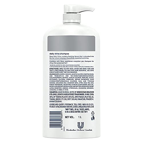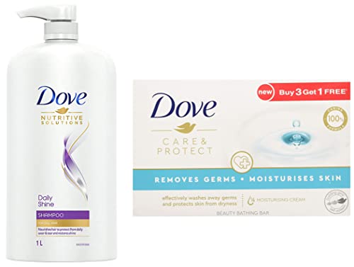 Dove Daily Shine Shampoo 1 L For Damaged or Frizzy Hair Makes Hair Soft Shiny And Smooth - Mild Daily Shampoo for Men & WomenThe mystery of how to get shiny hair isn't a tricky one to solve anymore. The key to getting shiny damage protected hair is making sure your hair is nourished from the start of your routine. That's where Dove Daily Shine Shampoo comes in. Dove Daily Shine Shampoo with Nutritive Serum builds a protective shield around the hair fiber and defends your hair from daily hair damage. It is a pleasant hair cleanser that gives you voluminous and healthy looking hair. With sunflower oil this Dove shampoo not only cleans your hair but gives you voluminous hair. It gives protection from the aggression your hair faces every day. Its Nutritive Serum formula absorbs into the hair strands to keep them beautifully nourished and shiny this Dove shampoo surrounds your hair with a protective shield defending it from everyday stresses like brushing damage. With regular use Dove Daily Shine shampoo makes your hair smooth shiny and beautiful looking. This Dove shampoo cleanses from roots up as well as it helps make your hair look healthy. The result? Beautifully shiny strong and silky hair which is everything you want it to be. *Based on lab test with Dove Daily Shine System vs non-conditioning shampooDove Care & Protect Bathing Bar - Removes 99% Germs & Moisturises Skin Plant-Based Cleansers 100 g (Buy 3 Get 1 Free)Dove Care & Protect Beauty Bar removes 99% germs and moisturizes skin with its gentle plant based cleansers. Removing germs can be tough on your skin but Dove Care & Protect is different from ordinary soaps. With plant-based cleansers and Doveâs ¼ moisturising cream Dove Care & Protect beauty bar effectively washes away germs while also protecting skin from dryness. Dove Care & Protect beauty bar helps to replenish moisture that is lost during the cleansing process â where a regular soap bar might leave your skin feeling dry and tight Dove Care & Protect effectively washes away germs and the classic moisturizing pH-balanced formula of Dove bars will leave skin softer smoother and more glowing. Remove germs & moisturise your skin with the 100% caring formula of Dove Care & Protect beauty bar. Dove is the No.1 soap Brand recommended by dermatologists. It is suitable for sensitive skin too. For best results lather up your Dove Care & Protect Beauty bathing bar and massage the smooth creamy lather over your face and body before rinsing thoroughly. Regular soap may dry out your skin but the moisturizing formula of Dove bars will leave skin softer smoother and more glowing. So washing away germs doesn't mean you need to compromise on your skin's nourishment.