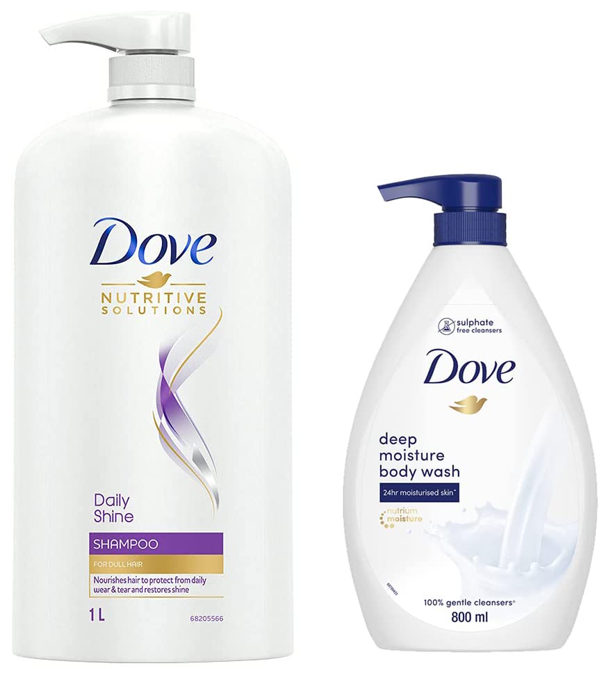Dove Daily Shine Shampoo 1 L For Damaged or Frizzy Hair Makes Hair Soft Shiny And Smooth - Mild Daily Shampoo for Men & WomenThe mystery of how to get shiny hair isn't a tricky one to solve anymore. The key to getting shiny damage protected hair is making sure your hair is nourished from the start of your routine. That's where Dove Daily Shine Shampoo comes in. Dove Daily Shine Shampoo with Nutritive Serum builds a protective shield around the hair fiber and defends your hair from daily hair damage. It is a pleasant hair cleanser that gives you voluminous and healthy looking hair. With sunflower oil this Dove shampoo not only cleans your hair but gives you voluminous hair. It gives protection from the aggression your hair faces every day. Its Nutritive Serum formula absorbs into the hair strands to keep them beautifully nourished and shiny this Dove shampoo surrounds your hair with a protective shield defending it from everyday stresses like brushing damage. With regular use Dove Daily Shine shampoo makes your hair smooth shiny and beautiful looking. This Dove shampoo cleanses from roots up as well as it helps make your hair look healthy. The result? Beautifully shiny strong and silky hair which is everything you want it to be. *Based on lab test with Dove Daily Shine System vs non-conditioning shampooDove Deeply Nourishing Body Wash With Moisturisers For Softer Smoother Skin For All Skin Type 800 mlWho doesnât like having smooth skin? We all want to keep our skin looking healthy nourished and well cared for and itâs much easier to make that a regular part of your routine if youâve found a moisturising body wash. This moisturising body wash combines Nutrium Moisture⢠with mild cleansers to help your skin retain its natural moisture leaving you with softer smoother skin. There are 631 million beautiful women in India. Women of all ages shapes sizes and skin tones. Yet as a society weâre often led to believe in a very limited idea of beauty. And while youthful looks fair skin long black flowing hair and a trim figure are some ways to express beauty â they are not the only ways. With your help we can represent the true diversity of beauty in India and empower every woman to realise her personal beauty potential. Together we can break the rules and change the face of beauty. We donât believe that the 631 million women living in India can possibly be represented by just one beauty ideal. Ours is a country rich in diversity and thatâs something we can all be proud of especially when it comes to beauty. We received an incredible response when we asked you to help us showcase #Real Beauty. We think that speaks volumes about how much we all want to see a more diverse range of beauty represented in India.