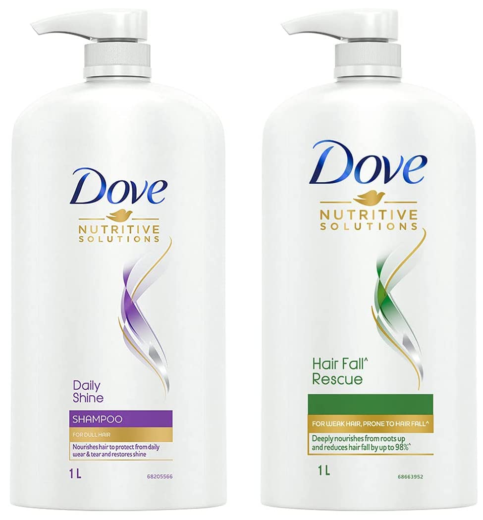 Dove Daily Shine Shampoo 1 L For Damaged or Frizzy Hair Makes Hair Soft Shiny And Smooth - Mild Daily Shampoo for Men & WomenThe mystery of how to get shiny hair isn't a tricky one to solve anymore. The key to getting shiny damage protected hair is making sure your hair is nourished from the start of your routine. That's where Dove Daily Shine Shampoo comes in. Dove Daily Shine Shampoo with Nutritive Serum builds a protective shield around the hair fiber and defends your hair from daily hair damage. It is a pleasant hair cleanser that gives you voluminous and healthy looking hair. With sunflower oil this Dove shampoo not only cleans your hair but gives you voluminous hair. It gives protection from the aggression your hair faces every day. Its Nutritive Serum formula absorbs into the hair strands to keep them beautifully nourished and shiny this Dove shampoo surrounds your hair with a protective shield defending it from everyday stresses like brushing damage. With regular use Dove Daily Shine shampoo makes your hair smooth shiny and beautiful looking. This Dove shampoo cleanses from roots up as well as it helps make your hair look healthy. The result? Beautifully shiny strong and silky hair which is everything you want it to be. *Based on lab test with Dove Daily Shine System vs non-conditioning shampooDove Hair Fall Rescue Shampoo For Weak Hair 1 LtrWe love the feeling of beautiful hair â but daily hair damage can leave your hair prone to breakage. Let hair fall* be an issue of the past! Use the Hair Fall* Rescue Shampoo from Dove regularly to get thick and luscious looking hair as the Dove shampoo works to reduce hair fall by up to 98%*. Specially formulated for better hair fall* control Dove Nutritive Solutions Hair Fall* Rescue Shampoo strengthens and nourishes fragile hair from roots up. Perfect as a daily hair fall* solution this unique formula fortifies strands to reduce hair fall*. Enriched with Nutrilock Actives our best shampoo for hair fall* immediately helps seal cuticles and strengthens strands to help minimize hair fall due to breakages leaving them looking fuller**. Healthier looking hair means lesser breakage and reduced hair fall*! Buy Dove Hair Fall Rescue Shampoo and forget your hair fall* troubles. Leaves your hair feeling strong and beautiful day after day. Say no to hair fall* worries and do more in life. Dove Hair Fall* Rescue lets you be stronger bolder and closer every day.*Hair fall refers to hair breakage**Hairfall due to breakage Based on a lab test with Dove Hair Fall Rescue System vs non-conditioning shampoo