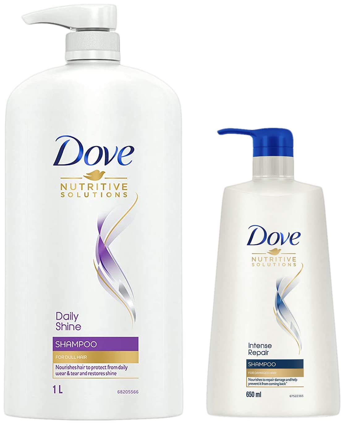 Dove Daily Shine Shampoo 1 L For Damaged or Frizzy Hair Makes Hair Soft Shiny And Smooth - Mild Daily Shampoo for Men & WomenThe mystery of how to get shiny hair isn't a tricky one to solve anymore. The key to getting shiny damage protected hair is making sure your hair is nourished from the start of your routine. That's where Dove Daily Shine Shampoo comes in. Dove Daily Shine Shampoo with Nutritive Serum builds a protective shield around the hair fiber and defends your hair from daily hair damage. It is a pleasant hair cleanser that gives you voluminous and healthy looking hair. With sunflower oil this Dove shampoo not only cleans your hair but gives you voluminous hair. It gives protection from the aggression your hair faces every day. Its Nutritive Serum formula absorbs into the hair strands to keep them beautifully nourished and shiny this Dove shampoo surrounds your hair with a protective shield defending it from everyday stresses like brushing damage. With regular use Dove Daily Shine shampoo makes your hair smooth shiny and beautiful looking. This Dove shampoo cleanses from roots up as well as it helps make your hair look healthy. The result? Beautifully shiny strong and silky hair which is everything you want it to be. *Based on lab test with Dove Daily Shine System vs non-conditioning shampooDove Intense Repair Shampoo 650 ml Repairs Dry and Damaged Hair Strengthening Shampoo for Smooth & Strong Hair - Mild Daily Shampoo for Men & WomenIs your hair showing signs of damage â split ends dryness roughness or hair fall? The secret of how to repair damaged hair? A strengthening shampoo that helps to treat the signs of damage with two-way care for both long and short-term results*. Give your hair the essential care it deserves with Dove Intense Repair Shampoo. The Intense Repair Shampoo works to restore the health and shine of your hair. It contains Fibre Actives which penetrate your hair and rebuild damaged hair to renew the lost gloss and vigour and give life to your damaged hair. Gentle enough for daily use Dove Intense Repair Shampoo helps to immediately repair strands while nourishing them from within for healthy looking hair thatâs stronger** Dove Intense Repair Shampoo for damaged hair repairs signs of damage for smooth and strong hair. Dove Intense Repair Shampoo formulated with Fibre Actives this shampoo for damaged hair reinforces strands to prevent the signs of damage on hair. Nourishment for damaged hair to leave you with beautiful looking hair all day long. *Based on lab test with Dove Intense Repair system vs non-conditioning shampoo **Strength against hair breakage based on lab test with Dove Intense Repair system vs. non-conditioning shampoo. Ingredients Water Sodium Laureth Sulfate Dimethiconol and Trideceth-10 and TEA-Dodecylbenzenesulfonate Glycol Distearate Cocamidopropyl Betaine Sodium Chloride Perfume Glycerin Cocamide MEA Amodimethicone and Cetrimonium Chloride and Trideceth-12 Guar Hydroxypropyltrimonium Chloride Acrylates/Beheneth-25 Methacrylate Copolymer Styrene/Acrylates Copolymer Mica and Titanium Dioxide Sodium Hydroxide Disodium EDTA Gluconolactone Trehalose Adipic Acid Sodium Sulfate PEG-45M DMDM Hydantoin Helianthus Annuus (Sunflower) Seed Oil Methylchloroisothiazolinone and Methylisothiazolinone Alpha-Isomethyl Ionone Citronellol Geraniol Linalool.