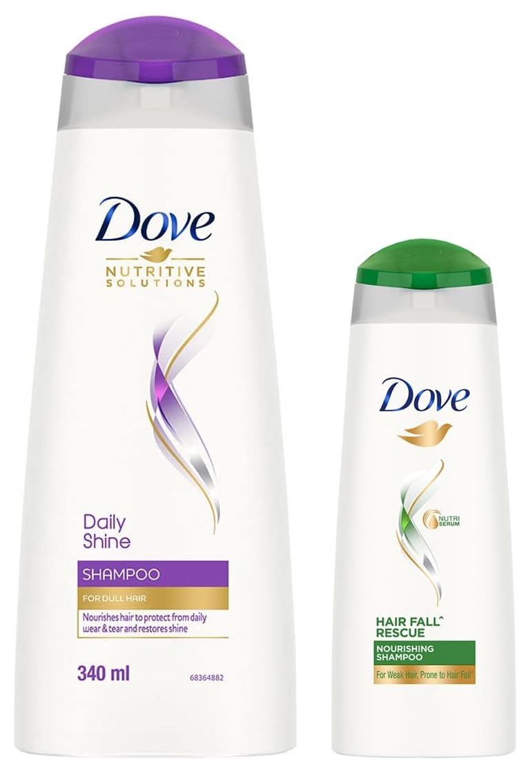 Dove Daily Shine Shampoo 340 ml For Dry and Damaged Hair Strengthening Shampoo Gives Smooth and Strong Hair - Mild Daily Shampoo for Men & WomenThe mystery of how to get shiny hair isn't a tricky one to solve anymore. The key to getting shiny damage protected hair is making sure your hair is nourished from the start of your routine. That's where Dove Daily Shine Shampoo comes in. Dove Daily Shine Shampoo with Nutritive Serum builds a protective shield around the hair fiber and defends your hair from daily hair damage. It is a pleasant hair cleanser that gives you voluminous and healthy looking hair. With sunflower oil this Dove shampoo not only cleans your hair but gives you voluminous hair. It gives protection from the aggression your hair faces every day. Its Nutritive Serum formula absorbs into the hair strands to keep them beautifully nourished and shiny this Dove shampoo surrounds your hair with a protective shield defending it from everyday stresses like brushing damage. With regular use Dove Daily Shine shampoo makes your hair smooth shiny and beautiful looking. This Dove shampoo cleanses from roots up as well as it helps make your hair look healthy. The result? Beautifully shiny strong and silky hair which is everything you want it to be. *Based on lab test with Dove Daily Shine System vs non-conditioning shampooDove Hair Fall Rescue Shampoo For Weak Hair 180 mlWe love the feeling of beautiful hair â but daily hair damage can leave your hair prone to breakage. Let hair fall* be an issue of the past! Use the Hair Fall* Rescue Shampoo from Dove regularly to get thick and luscious looking hair as the Dove shampoo works to reduce hair fall by up to 98%*. Specially formulated for better hair fall* control Dove Nutritive Solutions Hair Fall* Rescue Shampoo strengthens and nourishes fragile hair from roots up. Perfect as a daily hair fall* solution this unique formula fortifies strands to reduce hair fall*. Enriched with Nutrilock Actives our best shampoo for hair fall* immediately helps seal cuticles and strengthens strands to help minimize hair fall due to breakages leaving them looking fuller**. Healthier looking hair means lesser breakage and reduced hair fall*! Buy Dove Hair Fall Rescue Shampoo and forget your hair fall* troubles. Leaves your hair feeling strong and beautiful day after day. Say no to hair fall* worries and do more in life. Dove Hair Fall* Rescue lets you be stronger bolder and closer every day.*Hair fall refers to hair breakage**Hairfall due to breakage Based on a lab test with Dove Hair Fall Rescue System vs non-conditioning shampoo
