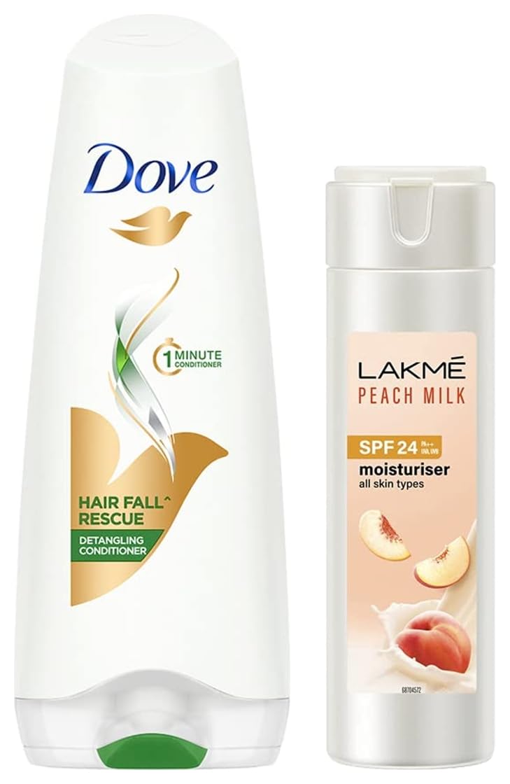 Dove Hair Fall Rescue Conditioner 180mlFortified with Nutrilock actives that nourish your hair from the roots the Hair Fall Rescue Conditioner from Dove will give you thicker shinier and stronger hair. Apply a small amount of conditioner daily after shampooing and wash it off after a 2-3 minutes. This conditioner will help in reducing hair fall and breakage thus giving you visibly fuller hair that you have always wanted! Buy Dove Hair Fall Rescue Conditioner here and watch your hair love itself! Caring for your hair from the roots up Dove Hair Fall Rescue Conditioner protects against hair fall by strengthening the strands against breakage. Formulated with Nutrilock actives it leaves hair strong and healthy-looking after each wash helping prevent further hair fall through damage. With its caring ingredients Dove Hair Fall Rescue Conditioner is suitable for every day use and best paired with its hair fall-fighting partner Hair Fall Rescue Shampoo. The gentle formula also works to reduce frizz and increase manageability while it strengthens â for visibly fuller beautiful hair. Help prevent hair fall with our nourishing Dove Hair Fall Rescue Conditioner for visibly fuller hair Based on lab test vs unclean hair Refers to hair fall due to breakage Based on a lab test with regular use of Dove Hair Fall Rescue SystemLakme Peach Milk SPF 24 PA Sunscreen Moisturiser 120 mlIs your skin loosing moisture as the day goes by ? Lakme brings to you a moisturizer which is a blend of wholesome peaches and milk which nourishes the skin deeply without making it appear oily. This light moisturizer dozed with SPF 24 has a soothing fragrance which will make you fall in love with it instantly. This lotion easily absorbs into the skin to lock moisture for 12 hours to give you soft smooth and glowing skin. Choose the right Peach Milk Moisturizer: for light nourishment pick this classic lotion. For intense nourishment - try the Peach Milk Winter lotion. For nourishment with sun protection try the Peach Milk SPF lotion. For best results - use everyday for nourished skin that glows. About Lakme: Lakme is Indiaâs No.1 Color Cosmetics brand offering a wide range of high-end world-class color cosmetic and skincare products. Lakme has a vast product range specially crafted by experts for the Indian skin. The brand has also been redefining fashion in India for over 15 years with Lakme Fashion Week Indiaâs premier fashion event. Allergies: In the unlikely event of skin irritation stop using and consult a doctor immediately. Warning: Avoid contact with eyes. Wash your eyes thoroughly with clean water in case of contact.