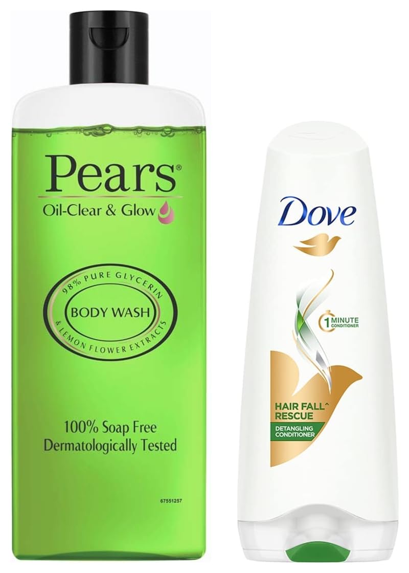 Dove Hair Fall Rescue Conditioner 180mlFortified with Nutrilock actives that nourish your hair from the roots the Hair Fall Rescue Conditioner from Dove will give you thicker shinier and stronger hair. Apply a small amount of conditioner daily after shampooing and wash it off after a 2-3 minutes. This conditioner will help in reducing hair fall and breakage thus giving you visibly fuller hair that you have always wanted! Buy Dove Hair Fall Rescue Conditioner here and watch your hair love itself! Caring for your hair from the roots up Dove Hair Fall Rescue Conditioner protects against hair fall by strengthening the strands against breakage. Formulated with Nutrilock actives it leaves hair strong and healthy-looking after each wash helping prevent further hair fall through damage. With its caring ingredients Dove Hair Fall Rescue Conditioner is suitable for every day use and best paired with its hair fall-fighting partner Hair Fall Rescue Shampoo. The gentle formula also works to reduce frizz and increase manageability while it strengthens â for visibly fuller beautiful hair. Help prevent hair fall with our nourishing Dove Hair Fall Rescue Conditioner for visibly fuller hair Based on lab test vs unclean hair Refers to hair fall due to breakage Based on a lab test with regular use of Dove Hair Fall Rescue SystemPears Oil Clear and Glow Shower Gel 250mlTry the new pears oil-clear and glow body wash crafted with 98 percent pure glycerin and lemon flower extract. It is a pure and gentle cleanser for your body that leaves your skin feeling soft smooth and moisturised. Pears body wash is mild and gentle and cleanses your skin thoroughly. It is 100 percent soap free and dermatologically tested. It helps moisturise your skin so that it does not dry. With natural oils it is a gentle cleanser for your body.