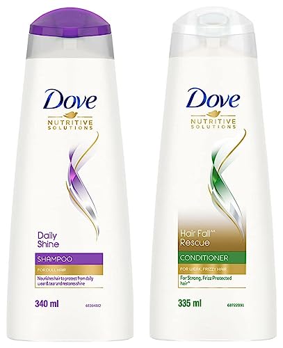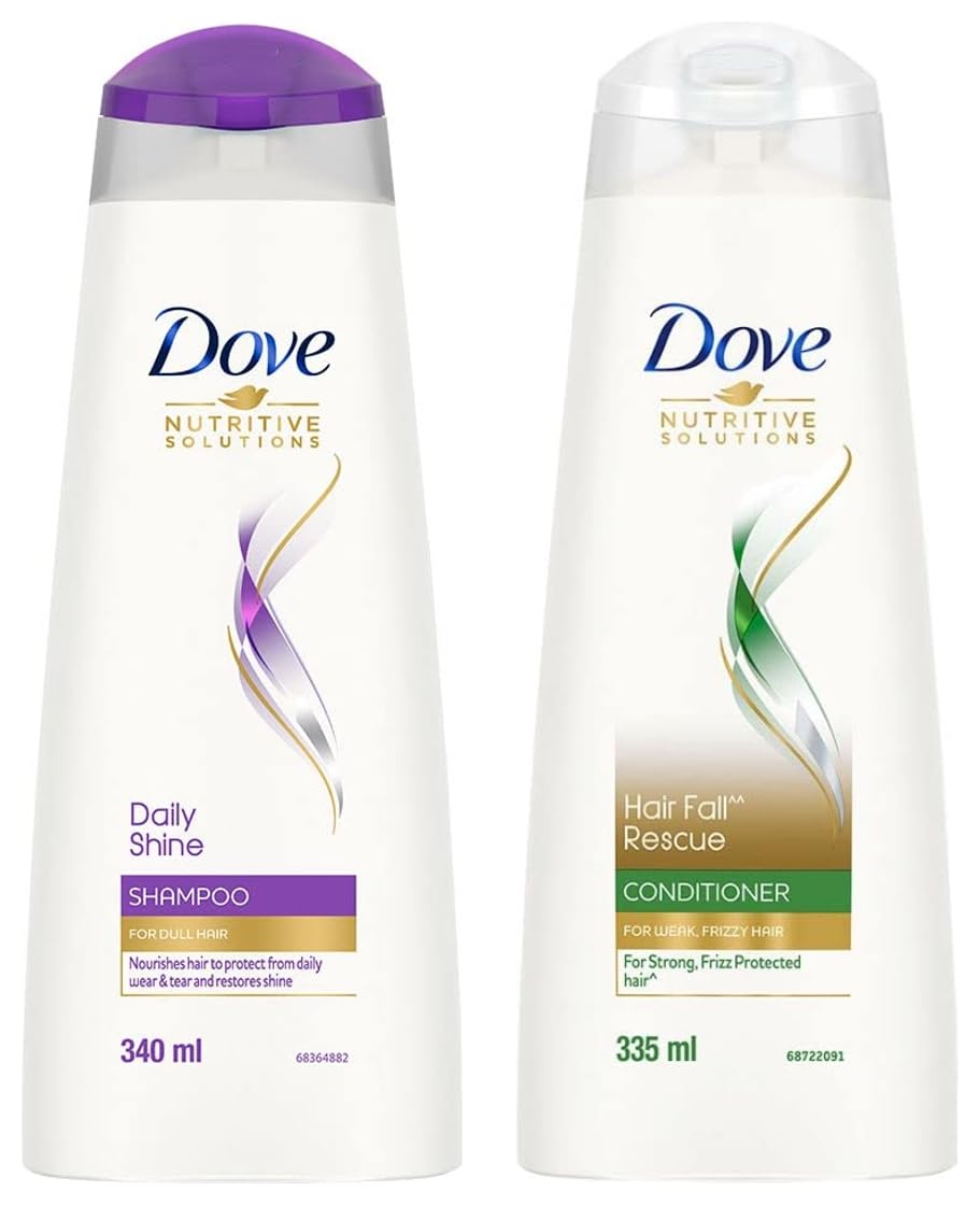 Dove Hair Fall Rescue Conditioner 335 ml Hair Fall Control for Smooth Frizz Free Hair - Deep Conditions Dry and Damaged Hair for Men & WomenLooking for a hair fall* solution that leaves you with beautifully strong hair? Tired of frizz that leaves your hair looking unmanageable and dry? Look no further. Everyday damage can stress strands leaving them prone to breakage. Specially created to prevent hair fall* Dove Nutritive Solutions Hair Fall Rescue Conditioner deeply nourishes fragile hair from roots up for better hair fall* control. Fortify hair fibers with every wash. Enriched with Nutrilock Actives the nourishing formula immediately seals cuticles and strengthens your hair to minimize breakage. Buy Dove Hair Fall Rescue Conditioner here and watch your hair love itself! Caring for your hair from the roots up Dove Hair Fall Rescue Conditioner protects against hair fall* by strengthening the strands against breakage. Formulated with Nutrilock actives it leaves hair strong and healthy-looking after each wash helping prevent further hair fall*. It also reduces frizz making hair appear smooth and free of fly away hair. This system is designed for strengthening your strands and making your hair better. Now for reduced hairfall worries dove ** Buy the New Dove Hair Fall Rescue conditioner! *Hair fall refers to hair breakage**Based on a lab test with Dove Hair Fall Rescue System vs non-conditioning shampooDove Daily Shine Shampoo 340 ml For Dry and Damaged Hair Strengthening Shampoo Gives Smooth and Strong Hair - Mild Daily Shampoo for Men & WomenThe mystery of how to get shiny hair isn't a tricky one to solve anymore. The key to getting shiny damage protected hair is making sure your hair is nourished from the start of your routine. That's where Dove Daily Shine Shampoo comes in. Dove Daily Shine Shampoo with Nutritive Serum builds a protective shield around the hair fiber and defends your hair from daily hair damage. It is a pleasant hair cleanser that gives you voluminous and healthy looking hair. With sunflower oil this Dove shampoo not only cleans your hair but gives you voluminous hair. It gives protection from the aggression your hair faces every day. Its Nutritive Serum formula absorbs into the hair strands to keep them beautifully nourished and shiny this Dove shampoo surrounds your hair with a protective shield defending it from everyday stresses like brushing damage. With regular use Dove Daily Shine shampoo makes your hair smooth shiny and beautiful looking. This Dove shampoo cleanses from roots up as well as it helps make your hair look healthy. The result? Beautifully shiny strong and silky hair which is everything you want it to be. *Based on lab test with Dove Daily Shine System vs non-conditioning shampoo