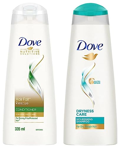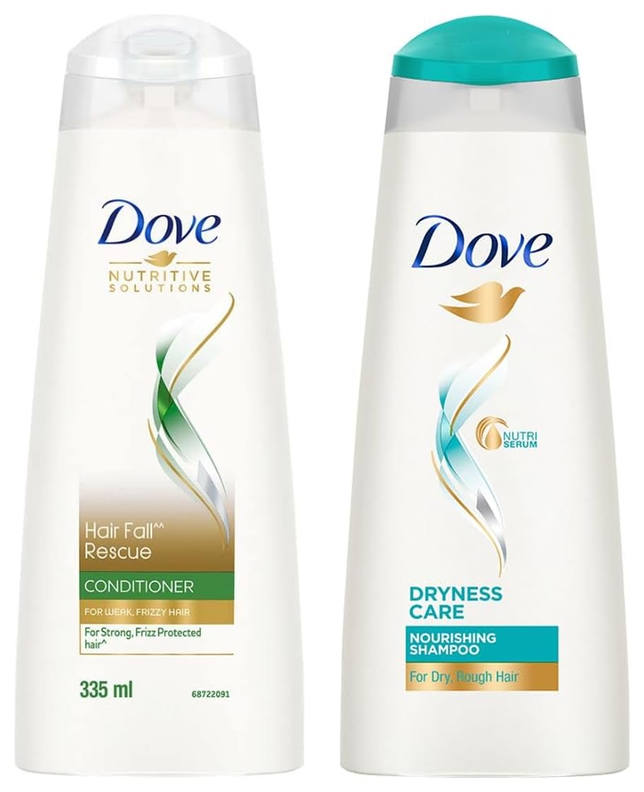 Dove Hair Fall Rescue Conditioner 335 ml Hair Fall Control for Smooth Frizz Free Hair - Deep Conditions Dry and Damaged Hair for Men & WomenLooking for a hair fall* solution that leaves you with beautifully strong hair? Tired of frizz that leaves your hair looking unmanageable and dry? Look no further. Everyday damage can stress strands leaving them prone to breakage. Specially created to prevent hair fall* Dove Nutritive Solutions Hair Fall Rescue Conditioner deeply nourishes fragile hair from roots up for better hair fall* control. Fortify hair fibers with every wash. Enriched with Nutrilock Actives the nourishing formula immediately seals cuticles and strengthens your hair to minimize breakage. Buy Dove Hair Fall Rescue Conditioner here and watch your hair love itself! Caring for your hair from the roots up Dove Hair Fall Rescue Conditioner protects against hair fall* by strengthening the strands against breakage. Formulated with Nutrilock actives it leaves hair strong and healthy-looking after each wash helping prevent further hair fall*. It also reduces frizz making hair appear smooth and free of fly away hair. This system is designed for strengthening your strands and making your hair better. Now for reduced hairfall worries dove ** Buy the New Dove Hair Fall Rescue conditioner! *Hair fall refers to hair breakage**Based on a lab test with Dove Hair Fall Rescue System vs non-conditioning shampooDove Dryness Care Shampoo 340 ml With Pro-Moisture Complex for Dry Hair & Scalp Gives Soft Smooth Damage Free Hair - Daily Shampoo for Men & WomenHarsh humid weather taking a toll on your beautiful hair causing damage with every passing day? Guard your hair against harsh weather. Crafted from a perfect blend of ingredients the shampoo helps to restore hair softness and smoothness. To help prevent daily hair damage Dove Nutritive Solutions Dryness Care Shampoo nourishes normal and dry locks for healthy looking hair. The shampoo cleans your dry locks and gives it a shiny and glossy look. The specially designed formula of this dryness care shampoo is perfect for days when your dry hair needs help. Dove Dryness Care Shampoo is just what you need for smooth and bouncy hair! This moisturizing and nourishing shampoo helps to protect hair from damage for silky soft locks. Uniquely formulated with Pro-Moisture Complex this Dove shampoo nourishes hair strands from within. Dove Dryness Care Shampoo nourishes hair with each application for strong hair thatâs manageable and healthy looking. Gently massage this shampoo into your scalp to create a lather and rinse well. After wash this shampoo makes your hair look glossy and locks dryness of your hair. Smooth soft and more resilient to daily damage from grooming and brushing beautiful hair is just one wash away with this nourishing shampoo.