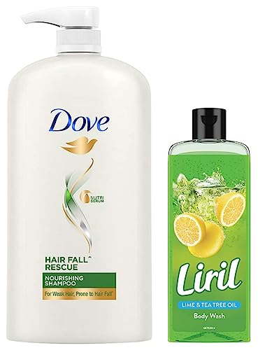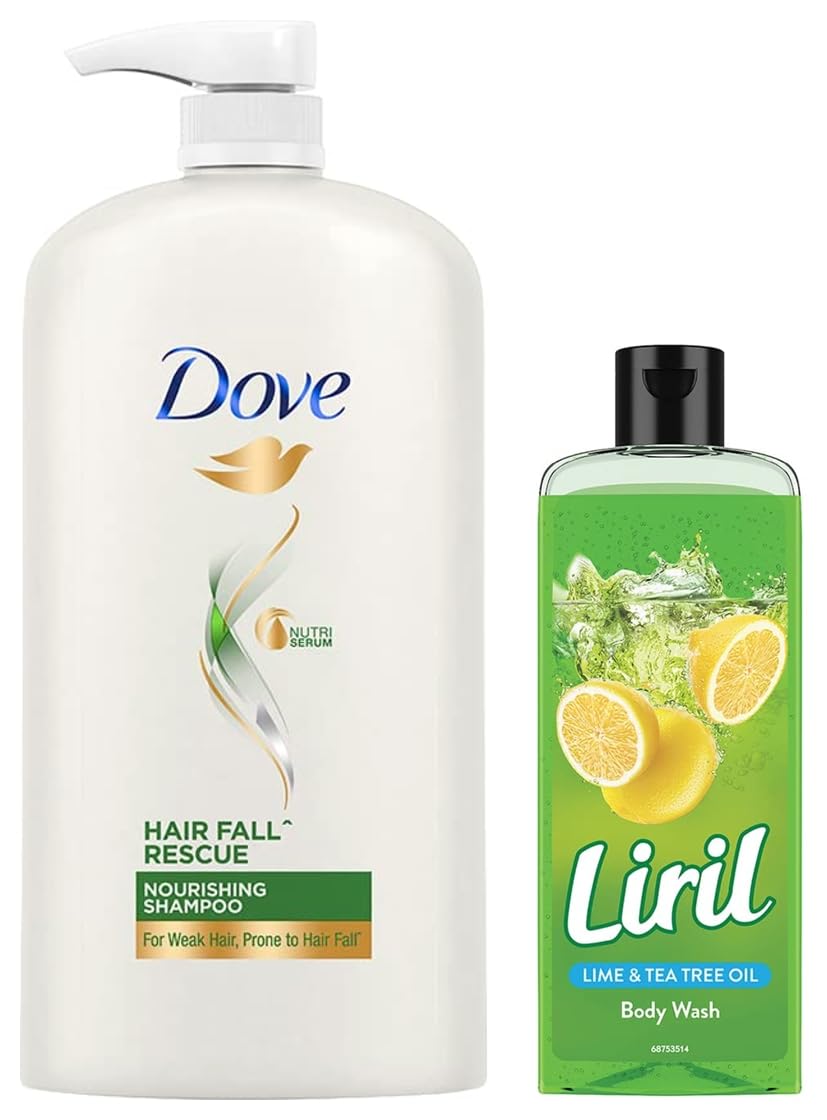 Dove Hair Fall Rescue Shampoo 1LWe love the feeling of beautiful hair â but daily damage can leave your hair prone to breakage. Let hair fall be an issue of the past. Use the hair fall rescue shampoo from Dove regularly to get thick and luscious hair as the shampoo works to reduce hair fall by up to 98 percent . Specially formulated for better hair fall control Dove nutritive solutions hair fall rescue shampoo strengthens and nourishes fragile hair from roots up. Perfect as a daily hair fall treatment the gentle formula fortifies strands to reduce hair fall . Enriched with nutrilock actives our best shampoo for hair fall immediately seals cuticles and strengthens strands to help minimize hair fall due to breakages leaving them looking fuller. Healthier hair means lesser breakage and reduced hair fall . Buy Dove hair fall rescue shampoo and forget your hair fall troubles. Leaving your hair feeling strong and beautiful day after day. Say no to hair fall worries and do more in life. Dove hair fall rescue lets you be stronger bolder and closer every day. Hair fall refers to hair breakage based on a lab test with Dove hair fall rescue system vs non-conditioning shampoo.Liril Lemon and Tea Tree Oil Body Wash 250 mlWake up fresh. Presenting new Liril lemon and tea tree body wash by unleashing the foam with our new range of body washes wake up fresh. Get ready for the most intense shower wrapped with the fresh fragrances. Watch the unique gel transform your shower experience leaving you fresh every day. Pour a drop of the freshness body wash and gently lather with a pouf. Massage all over your body to let your lather revive your senses every day. The ingredients in Liril body wash gives you a thick lather which lends a sense of freshness after every shower and makes bathing an enjoyable experience. Liril body wash gives you a fragrance which not only lasts whole day long but also keeps your skin healthy it ensures that your skin gets the best care and stays fresh after every wash. Liril body wash range has: Liril lemon and tea tree body wash Liril cooling mint body wash Liril berry blast body wash variants to choose from. How to use Liril body wash: Squeeze small amount of Liril body wash on wet hands. Work into a rich creamy lather. Apply gently over wet skin and then rinse off. Liril body wash is available right here - buy it now.