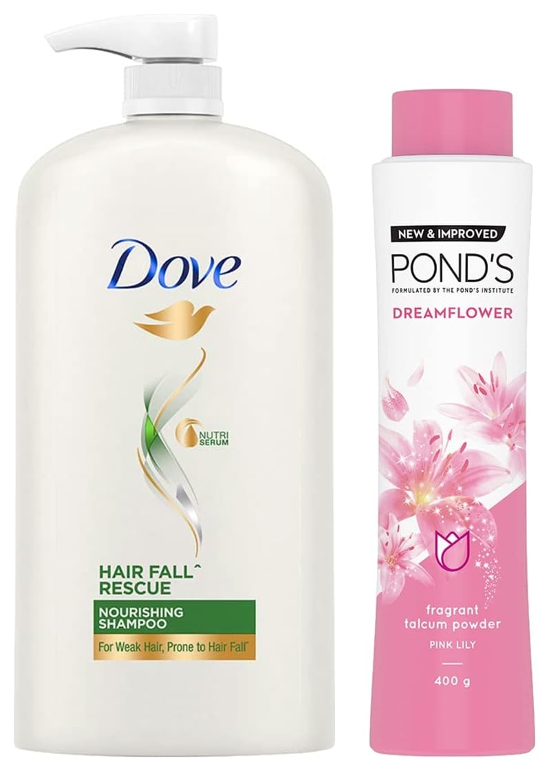 Dove Hair Fall Rescue Shampoo 1LWe love the feeling of beautiful hair â but daily damage can leave your hair prone to breakage. Let hair fall be an issue of the past. Use the hair fall rescue shampoo from Dove regularly to get thick and luscious hair as the shampoo works to reduce hair fall by up to 98 percent . Specially formulated for better hair fall control Dove nutritive solutions hair fall rescue shampoo strengthens and nourishes fragile hair from roots up. Perfect as a daily hair fall treatment the gentle formula fortifies strands to reduce hair fall . Enriched with nutrilock actives our best shampoo for hair fall immediately seals cuticles and strengthens strands to help minimize hair fall due to breakages leaving them looking fuller. Healthier hair means lesser breakage and reduced hair fall . Buy Dove hair fall rescue shampoo and forget your hair fall troubles. Leaving your hair feeling strong and beautiful day after day. Say no to hair fall worries and do more in life. Dove hair fall rescue lets you be stronger bolder and closer every day. Hair fall refers to hair breakage based on a lab test with Dove hair fall rescue system vs non-conditioning shampoo.POND'S Dreamflower Fragrant Talcum Powder Pink Lily 400 gWe often wonder if there is a product that could help us retain the shower like freshness throughout the day ! Get that instant burst of freshness after a shower with Pondâs Dreamflower Freshness Acacia Honey talc that will keep you rejuvenated & fresh for long hours. Infused with fragrance of Acacia Honey which is known for its skin care benefits Pondâs Dreamflower Freshness Acacia Honey talc â gives you soft & smooth skin throughout the day. Perfect for the summers Suitable for both men and women it helps you to stay refreshed to make you smell & feel beautiful. Talc the main ingredient is one of the softest mineral with fine texture - found in nature and helps to absorb the sweat. Use generously on your body to absorb sweat fight body odour and bacteria and powder your face for smoother and brighter skin. Pondâs Dreamflower talc comes in a vibrant pack with twist-lock button for quick and easy dispensing. This is new & improved formula that works for giving you fragrance and long hour freshness. Use this right after the shower in the morning & before going to the bed in night for that soothing freshness. The youthful and fruity fragrance of acacia honey will lure you the entire day. So go out with confidence and rule the world with this sweet scent of acacia honey.