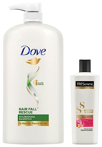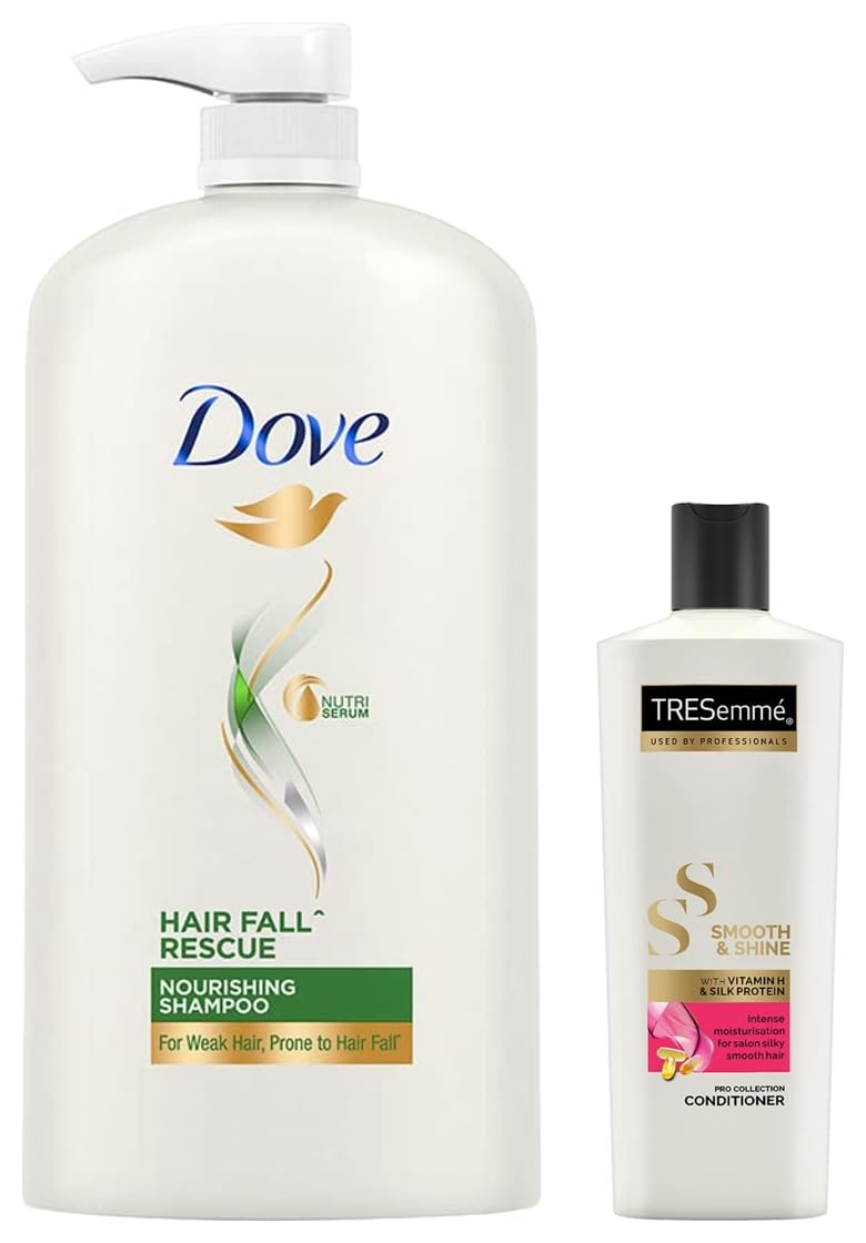 Dove Hair Fall Rescue Shampoo 1LWe love the feeling of beautiful hair â but daily damage can leave your hair prone to breakage. Let hair fall be an issue of the past. Use the hair fall rescue shampoo from Dove regularly to get thick and luscious hair as the shampoo works to reduce hair fall by up to 98 percent . Specially formulated for better hair fall control Dove nutritive solutions hair fall rescue shampoo strengthens and nourishes fragile hair from roots up. Perfect as a daily hair fall treatment the gentle formula fortifies strands to reduce hair fall . Enriched with nutrilock actives our best shampoo for hair fall immediately seals cuticles and strengthens strands to help minimize hair fall due to breakages leaving them looking fuller. Healthier hair means lesser breakage and reduced hair fall . Buy Dove hair fall rescue shampoo and forget your hair fall troubles. Leaving your hair feeling strong and beautiful day after day. Say no to hair fall worries and do more in life. Dove hair fall rescue lets you be stronger bolder and closer every day. Hair fall refers to hair breakage based on a lab test with Dove hair fall rescue system vs non-conditioning shampoo.TRESemme Smooth and Shine Conditioner 190mlLaunched in 1948 TRESemmé was named after renowned hair care expert Edna Emmé. Up until the 1950's TRESemmé was sold only in salons. Today it is available at a shop near you so that you can have salon style hair at home. For over 60 years TRESemmé has built a history of success in 13 countries around the world. From its origins in 1947 and salon expertise TRESemme has been driven by a simple truth: every woman deserves to look & feel fabulous like she has just stepped out of the salon everyday. This range has been carefully selected for its advanced formula. Driven by our salon heritage we work with our stylists to deliver expert solutions from salon quality products without the salon price tag. Our salon inspired products enriched with high quality ingredients help you experience that salon feeling everyday. With Vitamin H and silk protein TRESemme Smooth & Shine conditioner provides intense moisturisation for salon smooth silky hair. It has an advanced smoothing system that is enriched with Moroccan Argan oil. It controls frizz and fly aways without weighing your hair down. For hair that feels detangled more manageable soft and smooth. For best results use after the TRESemme Smooth & Shine Shampoo.